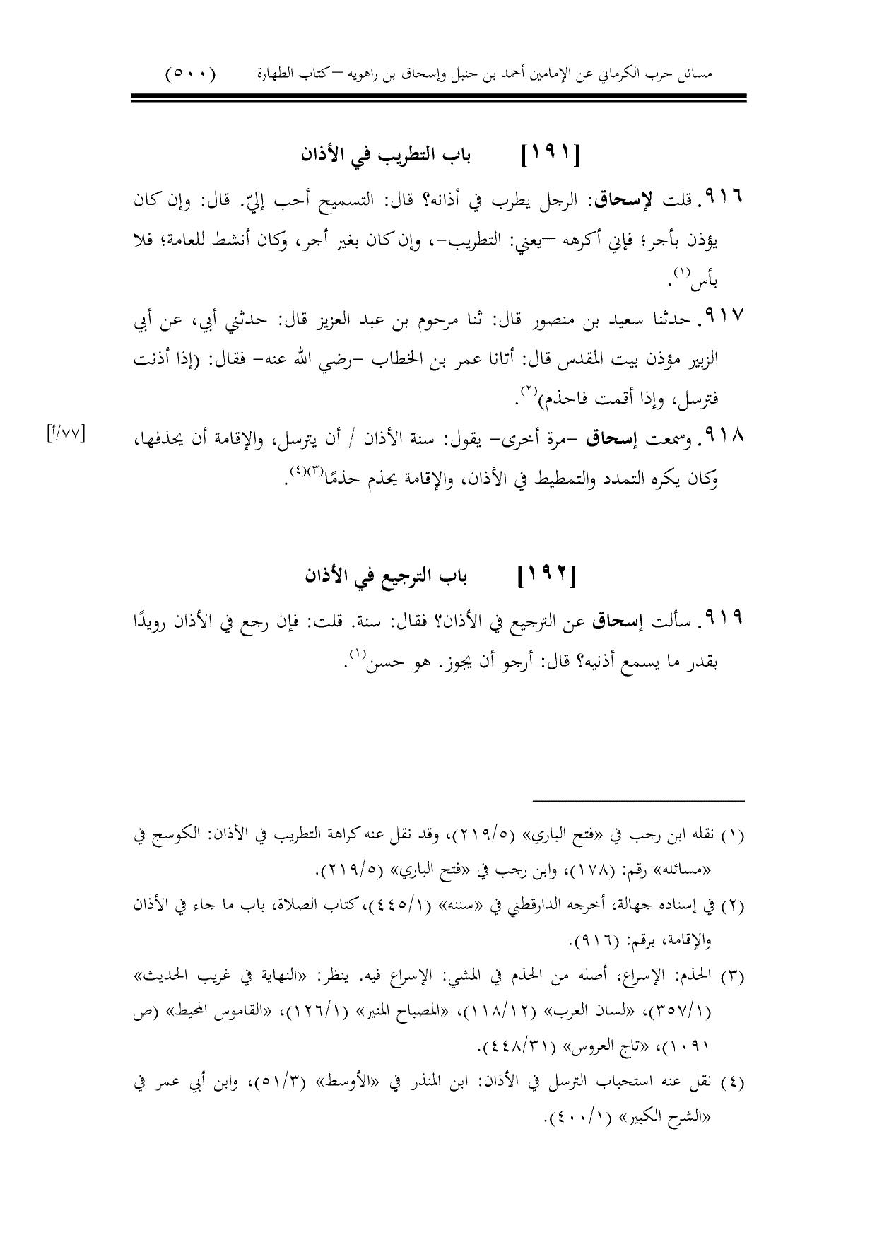 918 - وسمعت إسحاق -مرة أخرى- يقول: سنة الأذان / أن يترسل، والإقامة أن يحذفها، وكان يكره التمدد والتمطيط في الأذان، والإقامة يحذم حذمًا.