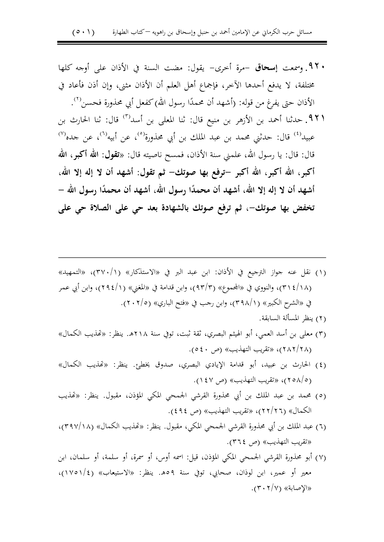 920 - وسمعت إسحاق -مرة أخرى- يقول: مضت السنة في الأذان على أوجه كلها مختلفة، لا يدفع أحدها الآخر، فإجماع أهل العلم أن الأذان مثنى، وإن أذن فأعاد في الأذان حتى يفرغ من قوله: (أشهد أن محمدًا رسول الله) كفعل أبي محذورة فحسن.