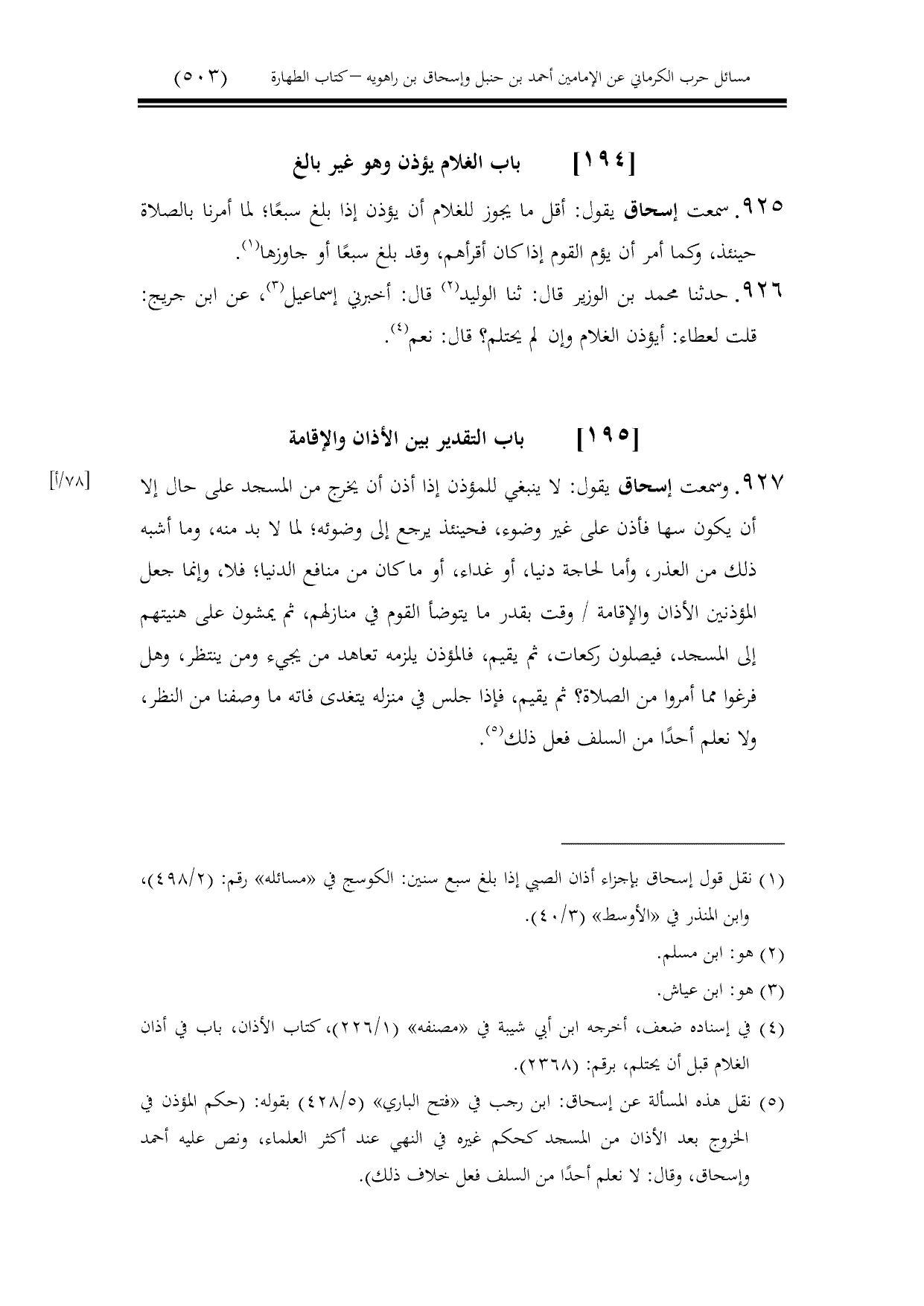 925 - سمعت إسحاق يقول: أقل ما يجوز للغلام أن يؤذن إذا بلغ سبعًا؛ لما أمرنا بالصلاة حينئذ، وكما أمر أن يؤم القوم إذا كان أقرأهم، وقد بلغ سبعًا أو جاوزها.