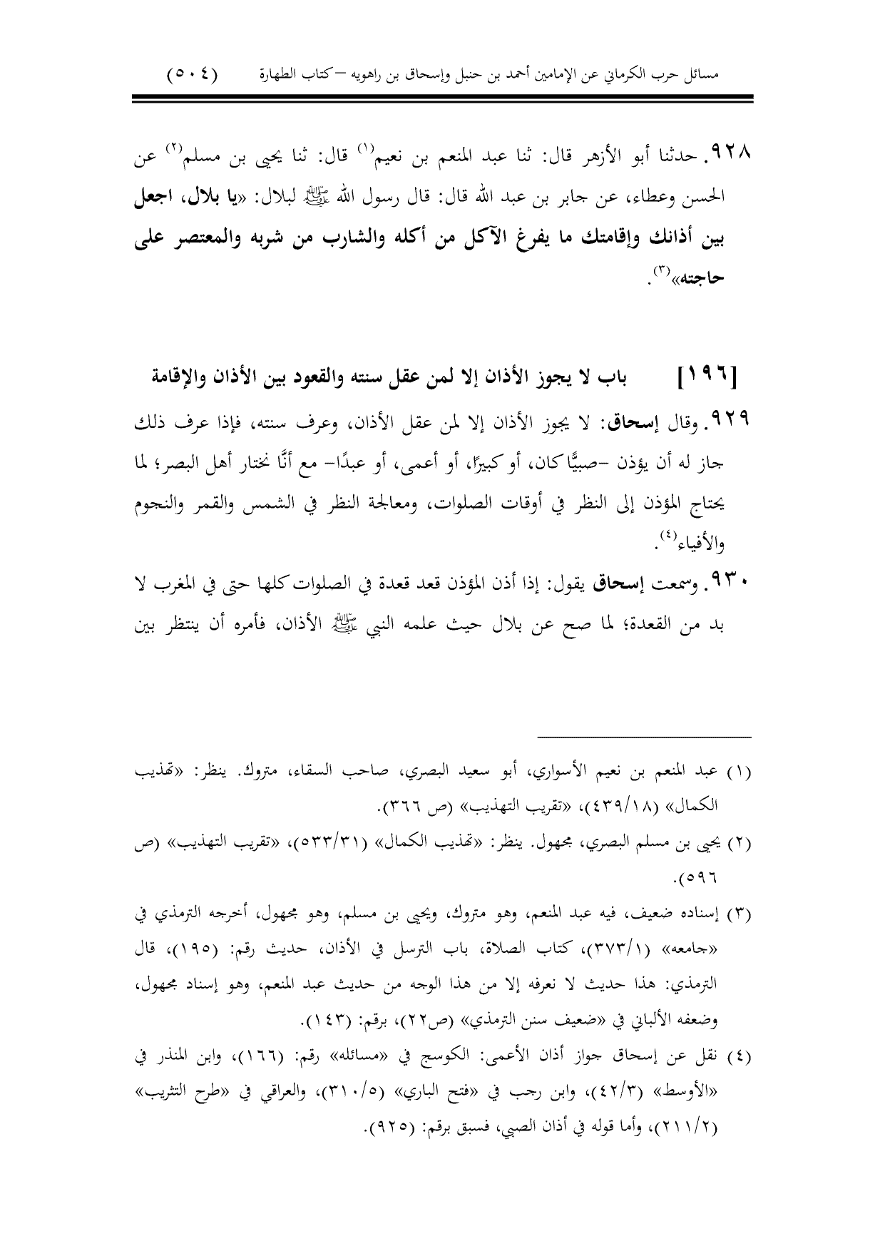 930 - وسمعت إسحاق يقول: إذا أذن المؤذن قعد قعدة في الصلوات كلها حتى في المغرب لا بد من القعدة؛ لما صح عن بلال حيث علمه النبي - صلى الله عليه وسلم - الأذان، فأمره أن ينتظر بين