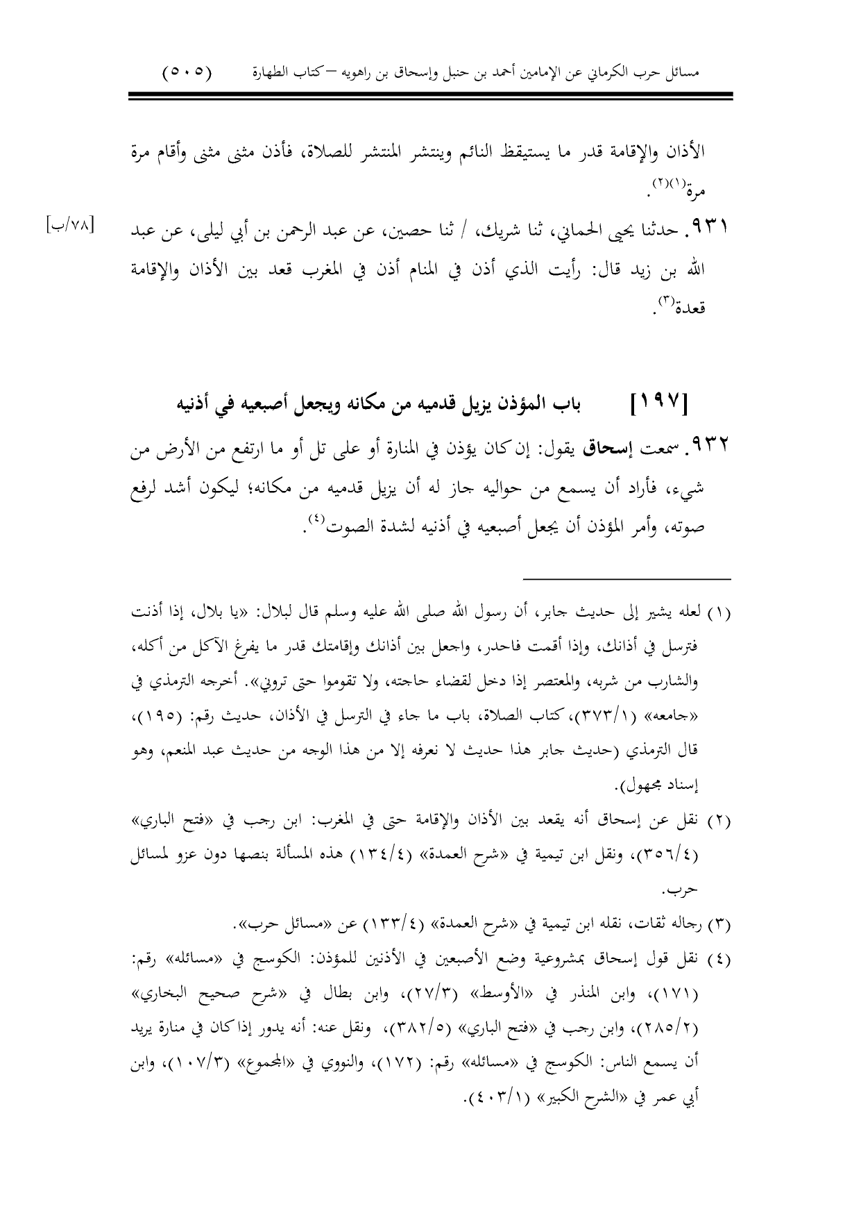 932 - سمعت إسحاق يقول: إن كان يؤذن في المنارة أو على تل أو ما ارتفع من الأرض من شيء، فأراد أن يسمع من حواليه جاز له أن يزيل قدميه من مكانه؛ ليكون أشد لرفع صوته، وأمر المؤذن أن يجعل أصبعيه في أذنيه لشدة الصوت.