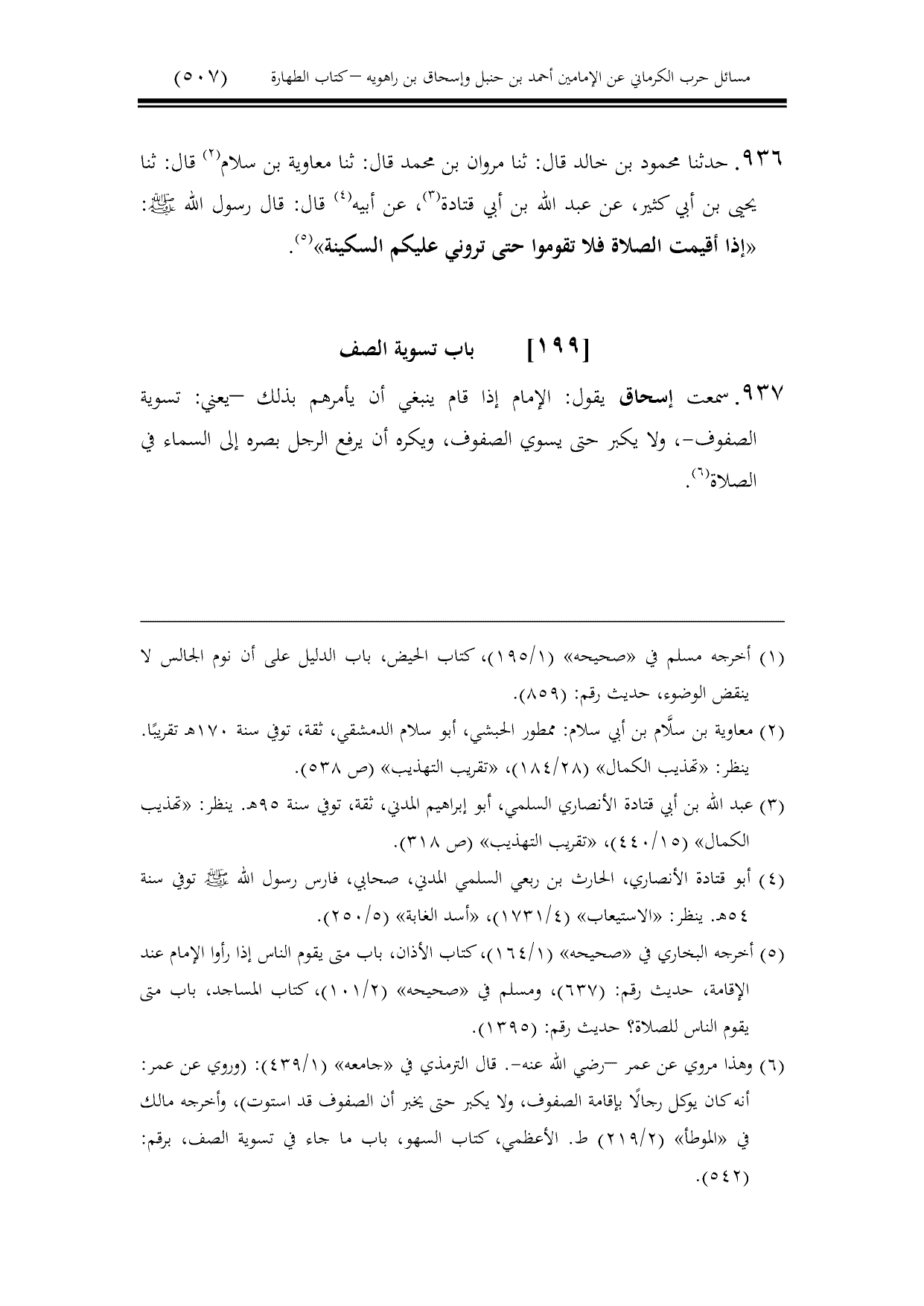 937 - سمعت إسحاق يقول: الإمام إذا قام ينبغي أن يأمرهم بذلك -يعني: تسوية الصفوف-، ولا يكبر حتى يسوي الصفوف، ويكره أن يرفع الرجل بصره إلى السماء في الصلاة.