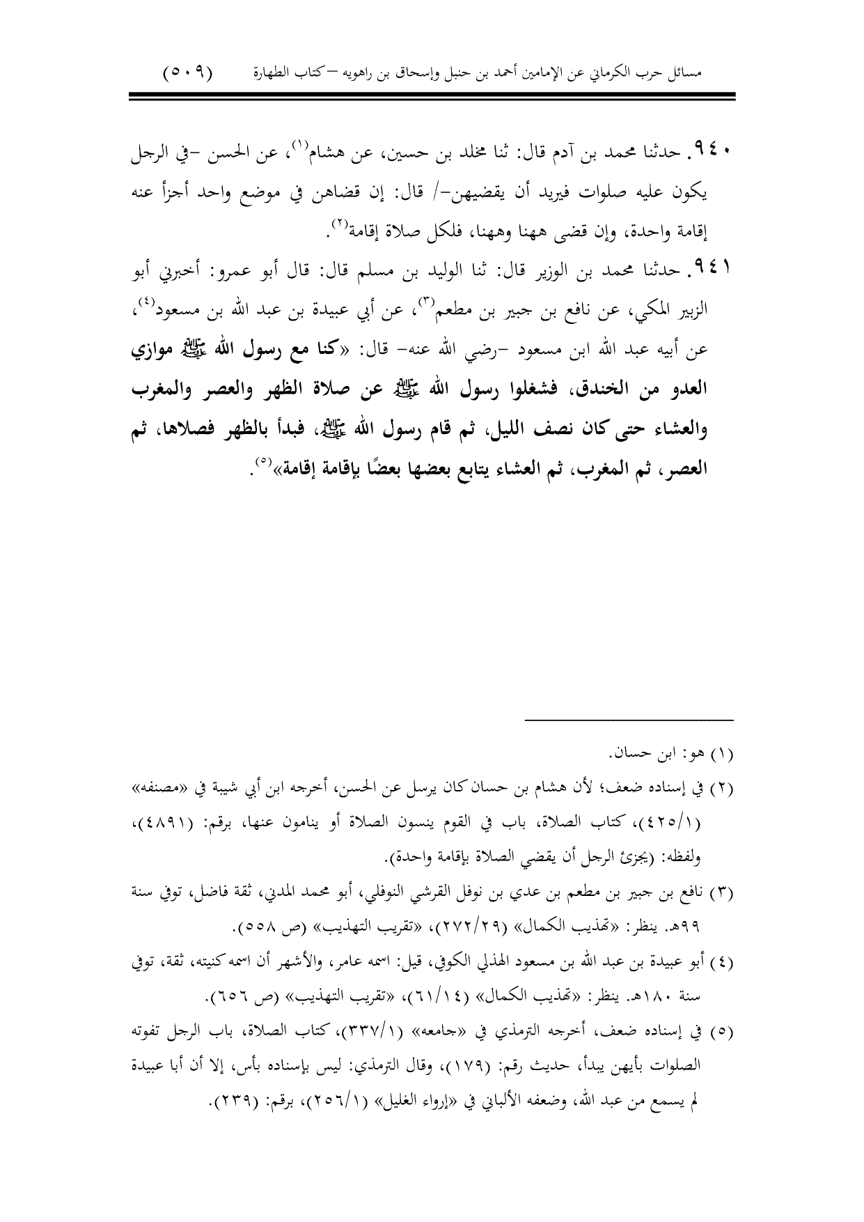 941 - حدثنا محمد بن الوزير قال: ثنا الوليد بن مسلم قال: قال أبو عمرو: أخبرني أبو الزبير المكي، عن نافع بن جبير بن مطعم، عن أبي عبيدة بن عبد الله بن مسعود، عن أبيه عبد الله ابن مسعود -رضي الله عنه- قال: «كنا مع رسول الله - صلى الله عليه وسلم - موازي العدو من الخندق، فشغلوا رسول الله - صلى الله عليه وسلم - عن صلاة الظهر والعصر والمغرب والعشاء حتى كان نصف الليل، ثم قام رسول الله - صلى الله عليه وسلم -، فبدأ بالظهر فصلاها، ثم العصر، ثم المغرب، ثم العشاء يتابع بعضها بعضًا بإقامة إقامة».