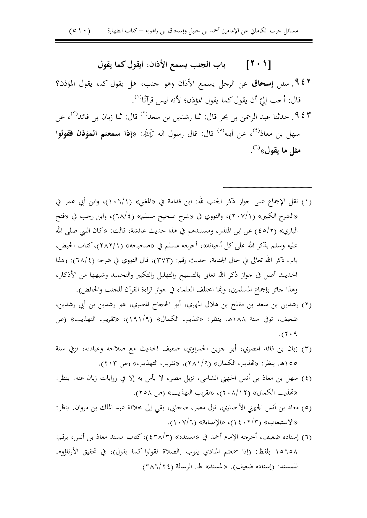 942 - سئل إسحاق عن الرجل يسمع الأذان وهو جنب، هل يقول كما يقول المؤذن؟ قال: أحب إليّ أن يقول كما يقول المؤذن؛ لأنه ليس قرآنًا.