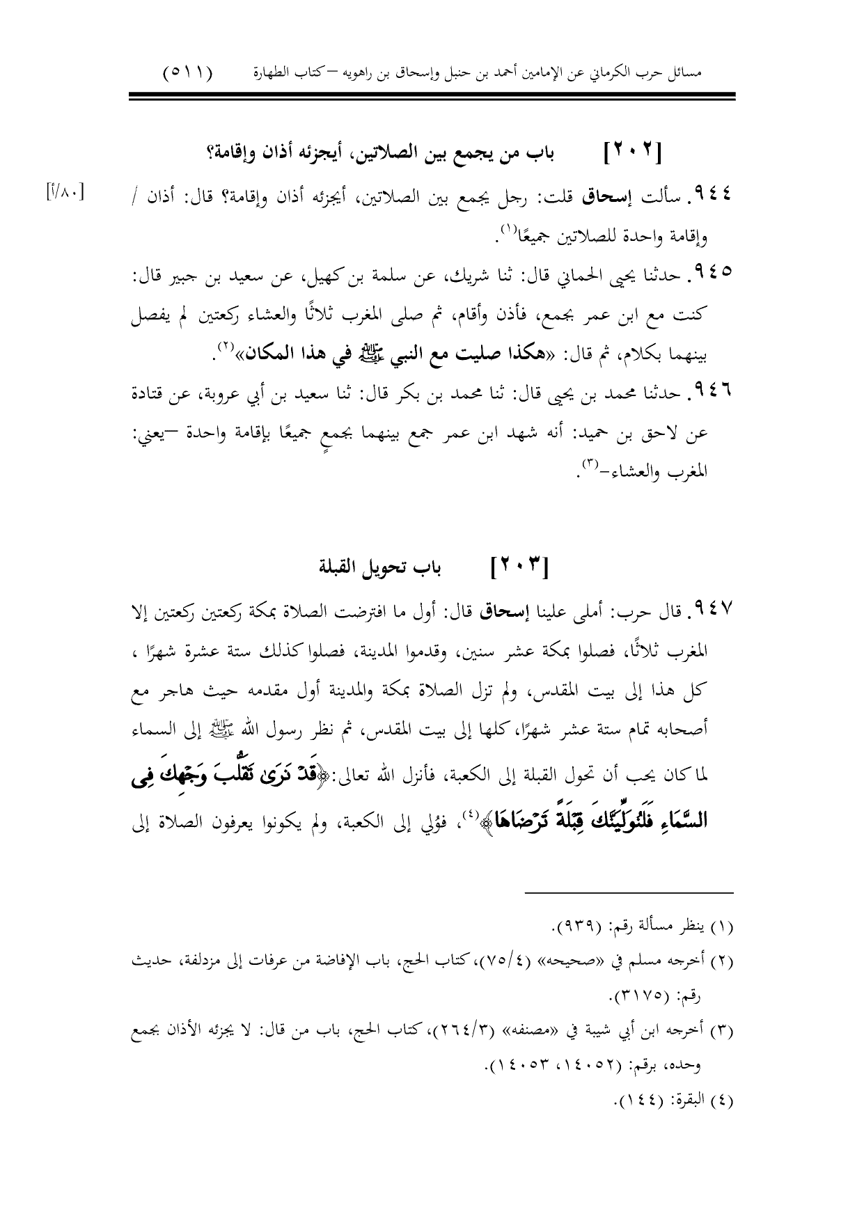947 - قال حرب: أملى علينا إسحاق قال: أول ما افترضت الصلاة بمكة ركعتين ركعتين إلا المغرب ثلاثًا، فصلوا بمكة عشر سنين، وقدموا المدينة، فصلوا كذلك ستة عشرة شهرًا، كل هذا إلى بيت المقدس، ولم تزل الصلاة بمكة والمدينة أول مقدمه حيث هاجر مع أصحابه تمام ستة عشر شهرًا، كلها إلى بيت المقدس، ثم نظر رسول الله - صلى الله عليه وسلم - إلى السماء لما كان يحب أن تحول القبلة إلى الكعبة، فأنزل الله تعالى: {قَدْ نَرَى تَقَلُّبَ وَجْهِكَ فِي السَّمَاءِ فَلَنُوَلِّيَنَّكَ قِبْلَةً تَرْضَاهَا}، فوُلي إلى الكعبة، ولم يكونوا يعرفون الصلاة إلى