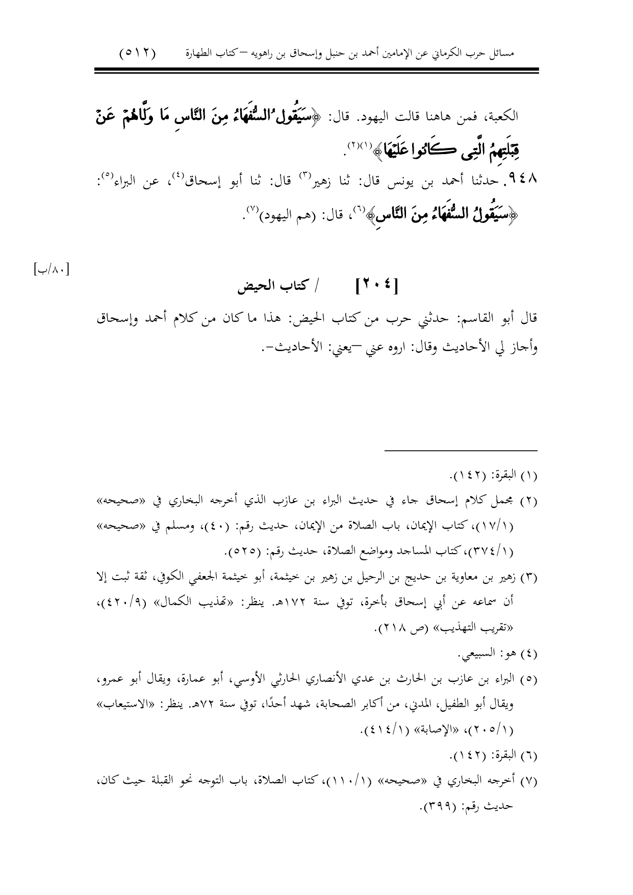 قال أبو القاسم: حدثني حرب من كتاب الحيض: هذا ما كان من كلام أحمد وإسحاق وأجاز لي الأحاديث وقال: اروه عني -يعني: الأحاديث-.