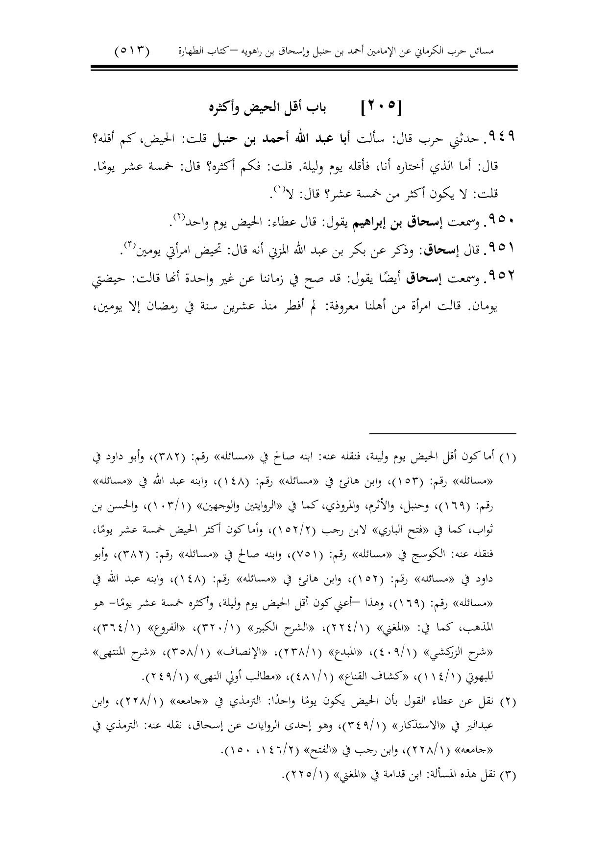 949 - حدثني حرب قال: سألت أبا عبد الله أحمد بن حنبل قلت: الحيض، كم أقله؟ قال: أما الذي أختاره أنا، فأقله يوم وليلة. قلت: فكم أكثره؟ قال: خمسة عشر يومًا. قلت: لا يكون أكثر من خمسة عشر؟ قال: لا.