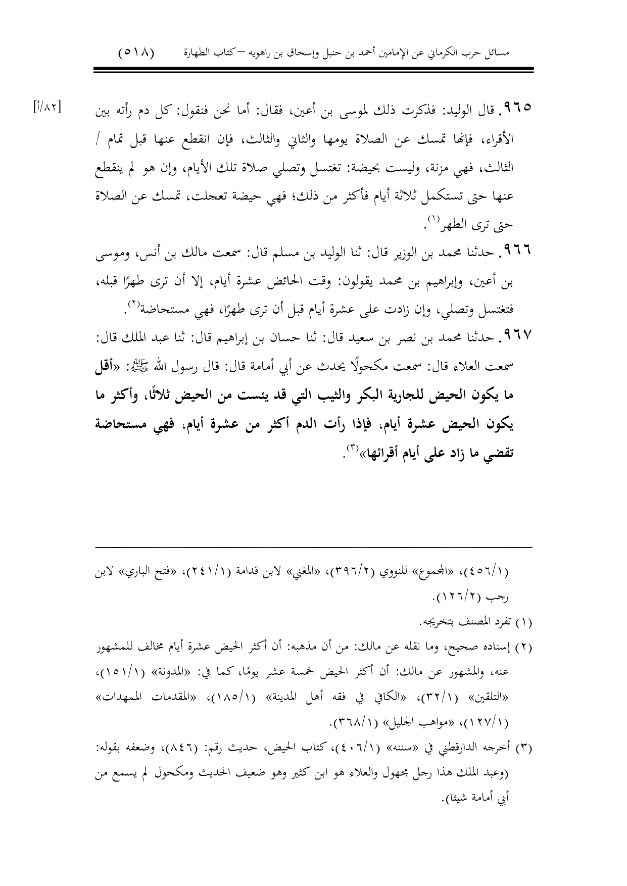 967 - حدثنا محمد بن نصر بن سعيد قال: ثنا حسان بن إبراهيم قال: ثنا عبد الملك قال: سمعت العلاء قال: سمعت مكحولًا يحدث عن أبي أمامة قال: قال رسول الله - صلى الله عليه وسلم -: «أقل ما يكون الحيض للجارية البكر والثيب التي قد يئست من الحيض ثلاثًا، وأكثر ما يكون الحيض عشرة أيام، فإذا رأت الدم أكثر من عشرة أيام، فهي مستحاضة تقضي ما زاد على أيام أقرائها».