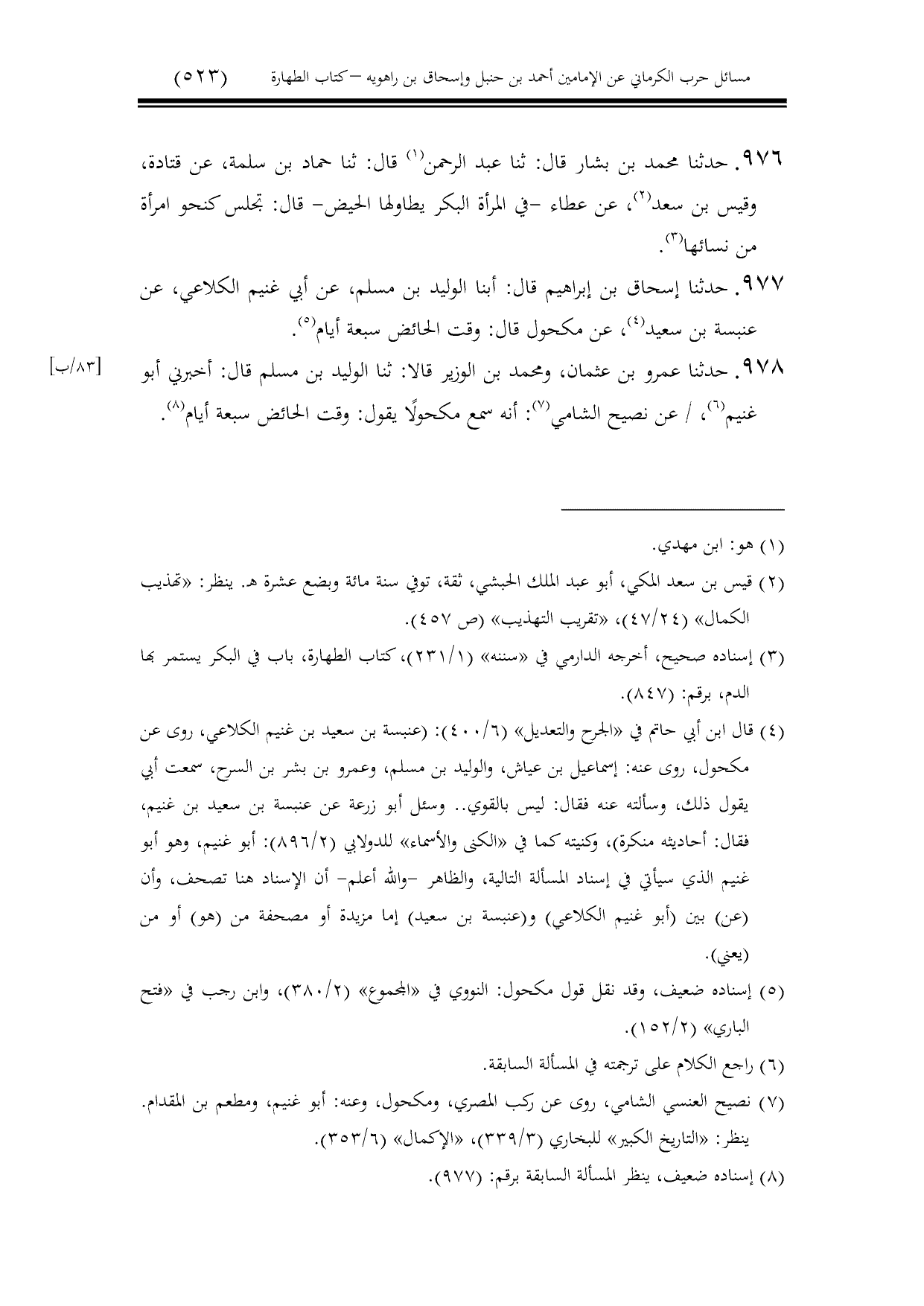 977 - حدثنا إسحاق بن إبراهيم قال: أبنا الوليد بن مسلم، عن أبي غنيم الكلاعي، عن عنبسة بن سعيد، عن مكحول قال: وقت الحائض سبعة أيام.