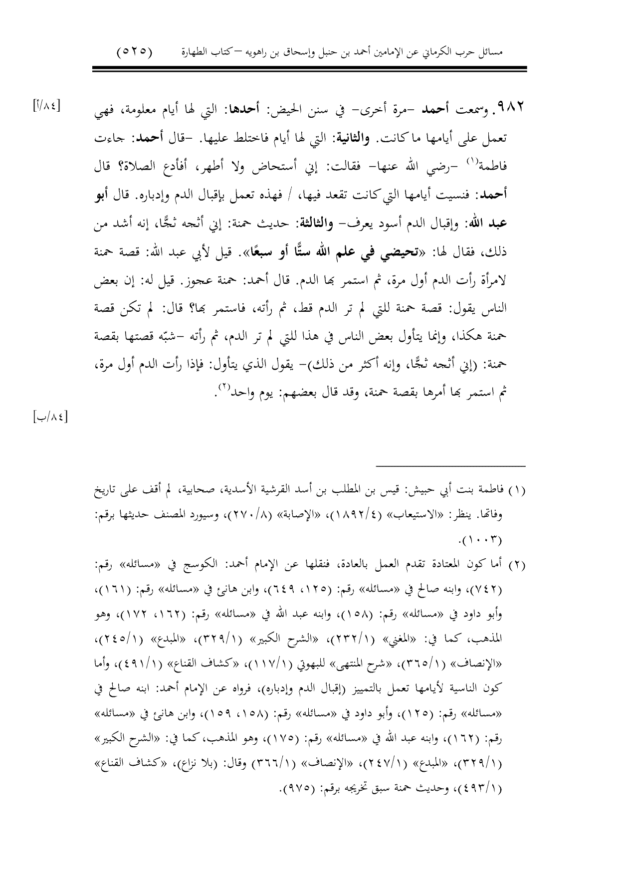 982 - وسمعت أحمد -مرة أخرى- في سنن الحيض: أحدها: التي لها أيام معلومة، فهي تعمل على أيامها ما كانت. والثانية: التي لها أيام فاختلط عليها. -قال أحمد: جاءت فاطمة -رضي الله عنها- فقالت: إني أستحاض ولا أطهر، أفأدع الصلاة؟ قال أحمد: فنسيت أيامها التي كانت تقعد فيها، / فهذه تعمل بإقبال الدم وإدباره. قال أبو عبد الله: وإقبال الدم أسود يعرف- والثالثة: حديث حمنة: إني أثجه ثجًّا، إنه أشد من ذلك، فقال لها: «تحيضي في علم الله ستًّا أو سبعًا». قيل لأبي عبد الله: قصة حمنة لامرأة رأت الدم أول مرة، ثم استمر بها الدم. قال أحمد: حمنة عجوز. قيل له: إن بعض الناس يقول: قصة حمنة للتي لم تر الدم قط، ثم رأته، فاستمر بها؟ قال: لم تكن قصة حمنة هكذا، وإنما يتأول بعض الناس في هذا للتي لم تر الدم، ثم رأته -شبّه قصتها بقصة حمنة: (إني أثجه ثجًّا، وإنه أكثر من ذلك) - يقول الذي يتأول: فإذا رأت الدم أول مرة، ثم استمر بها أمرها بقصة حمنة، وقد قال بعضهم: يوم واحد.