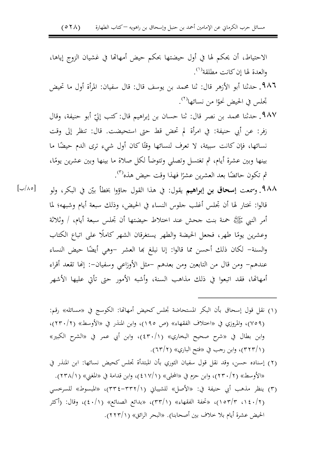 988 - وسمعت إسحاق بن إبراهيم يقول: في هذا القول جاؤوا بخطأ بيّن في البكر، ولو قالوا: نختار لها أن تجلس أغلب جلوس النساء في الحيض، وذلك سبعة أيام وشبهه؛ لما أمر النبي - صلى الله عليه وسلم - حمنة بنت جحش عند اختلاط حيضتها أن تجلس سبعة أيام، / وثلاثة وعشرين يومًا طهر، فجعل الحيضة والطهر يستغرقان الشهر كاملًا على اتباع الكتاب والسنة- لكان ذلك أحسن مما قالوا: إنا نبلغ بها العشر -وهي أيضًا حيض النساء عندهم- ومن قال من التابعين ومن بعدهم -مثل الأوزاعي وسفيان-: إنها تقعد أقراء أمهاتها، فقد اتبعوا في ذلك مذاهب السنة، وأشبه الأمور حتى تأتي عليها الأشهر