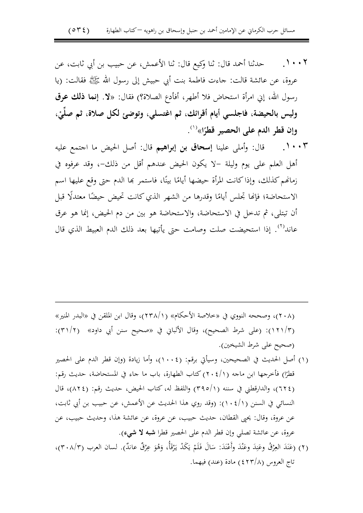 1003 - قال: وأملى علينا إسحاق بن إبراهيم قال: أصل الحيض ما اجتمع عليه أهل العلم على يوم وليلة -لا يكون الحيض عندهم أقل من ذلك-، وقد عرفوه في زمانهم كذلك، وإذا كانت المرأة حيضها أيامًا بينًا، فاستمر بها الدم حتى وقع عليها اسم الاستحاضة؛ فإنها تجلس أيامًا وقدرها من الشهر الذي كانت تحيض حيضًا معتدلًا قبل أن تبتلى، ثم تدخل في الاستحاضة، والاستحاضة هو بين من دم الحيض، إنما هو عرق عاند. إذا استحيضت صلت وصامت حتى يأتيها بعد ذلك الدم العبيط الذي قال