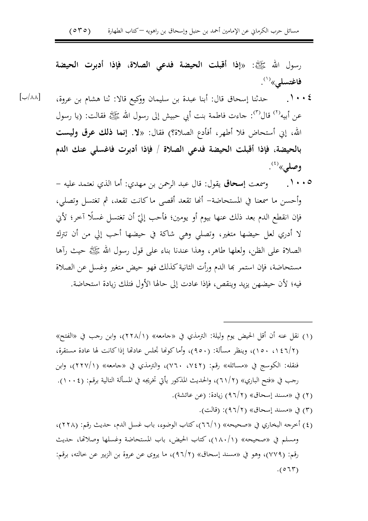 1004 - حدثنا إسحاق قال: أبنا عبدة بن سليمان ووكيع قالا: ثنا هشام بن عروة، عن أبيه قال: جاءت فاطمة بنت أبي حبيش إلى رسول الله - صلى الله عليه وسلم - فقالت: (يا رسول الله، إني أستحاض فلا أطهر، أفأدع الصلاة؟) فقال: «لا. إنما ذلك عرق وليست بالحيضة، فإذا أقبلت الحيضة فدعي الصلاة / فإذا أدبرت فاغسلي عنك الدم وصلي».