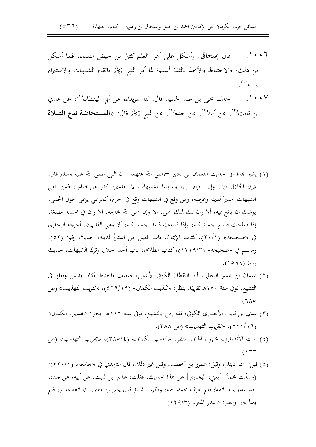 1006 - قال إسحاق: وأشكل على أهل العلم كثيرٌ من حيض النساء، فما أشكل من ذلك، فالاحتياط والأخذ بالثقة أسلم؛ لما أمر النبي - صلى الله عليه وسلم - باتقاء الشبهات والاستبراء لدينه.