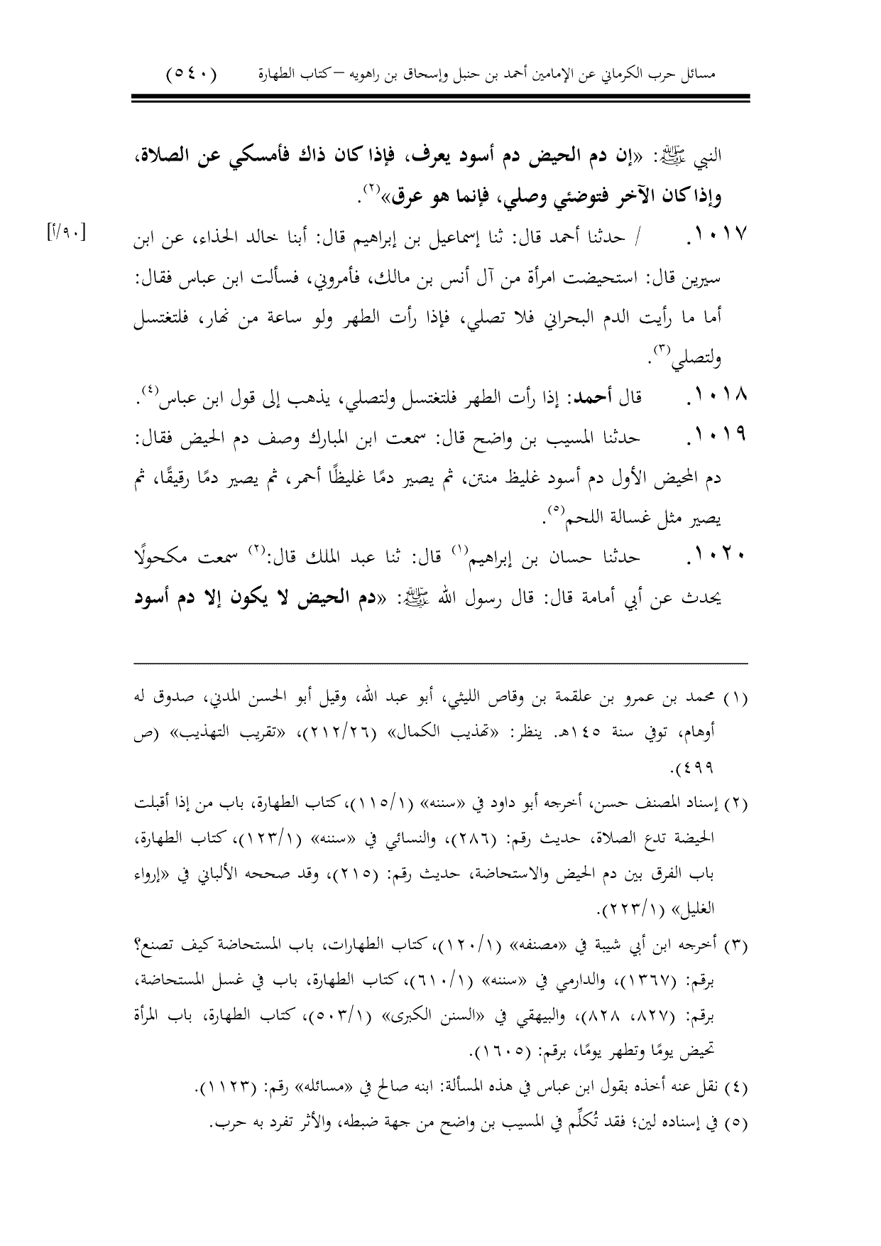 1020 - حدثنا حسان بن إبراهيم قال: ثنا عبد الملك قال: سمعت مكحولًا يحدث عن أبي أمامة قال: قال رسول الله - صلى الله عليه وسلم -: «دم الحيض لا يكون إلا دم أسود