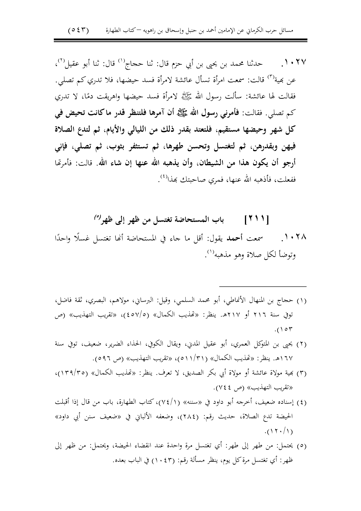 1027 - حدثنا محمد بن يحيى بن أبي حزم قال: ثنا حجاج قال: ثنا أبو عقيل، عن بهية قالت: سمعت امرأة تسأل عائشة لامرأة فسد حيضها، فلا تدري كم تصلي. فقالت لها عائشة: سألت رسول الله - صلى الله عليه وسلم - لامرأة فسد حيضها واهريقت دمًا، لا تدري كم تصلي. فقالت: فأمرني رسول الله - صلى الله عليه وسلم - أن آمرها فلتنظر قدر ما كانت تحيض في كل شهر وحيضها مستقيم، فلتعتد بقدر ذلك من الليالي والأيام، ثم لتدع الصلاة فيهن وبقدرهن، ثم لتغتسل وتحسن طهرها، ثم تستثفر بثوب، ثم تصلي، فإني أرجو أن يكون هذا من الشيطان، وأن يذهبه الله عنها إن شاء الله. قالت: فأمرتها ففعلت، فأذهبه الله عنها، فمري صاحبتك بهذا.