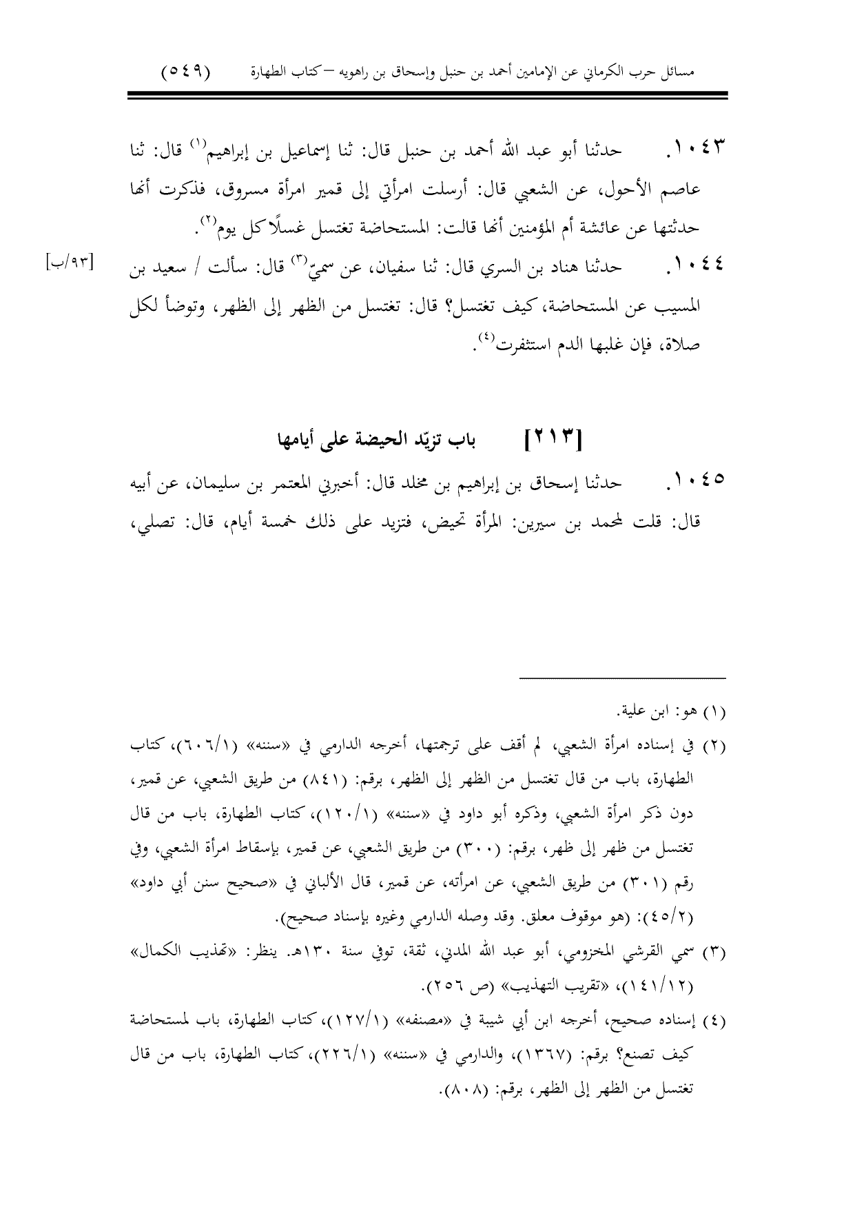 1043 - حدثنا أبو عبد الله أحمد بن حنبل قال: ثنا إسماعيل بن إبراهيم قال: ثنا عاصم الأحول، عن الشعبي قال: أرسلت امرأتي إلى قمير امرأة مسروق، فذكرت أنها حدثتها عن عائشة أم المؤمنين أنها قالت: المستحاضة تغتسل غسلًا كل يوم.