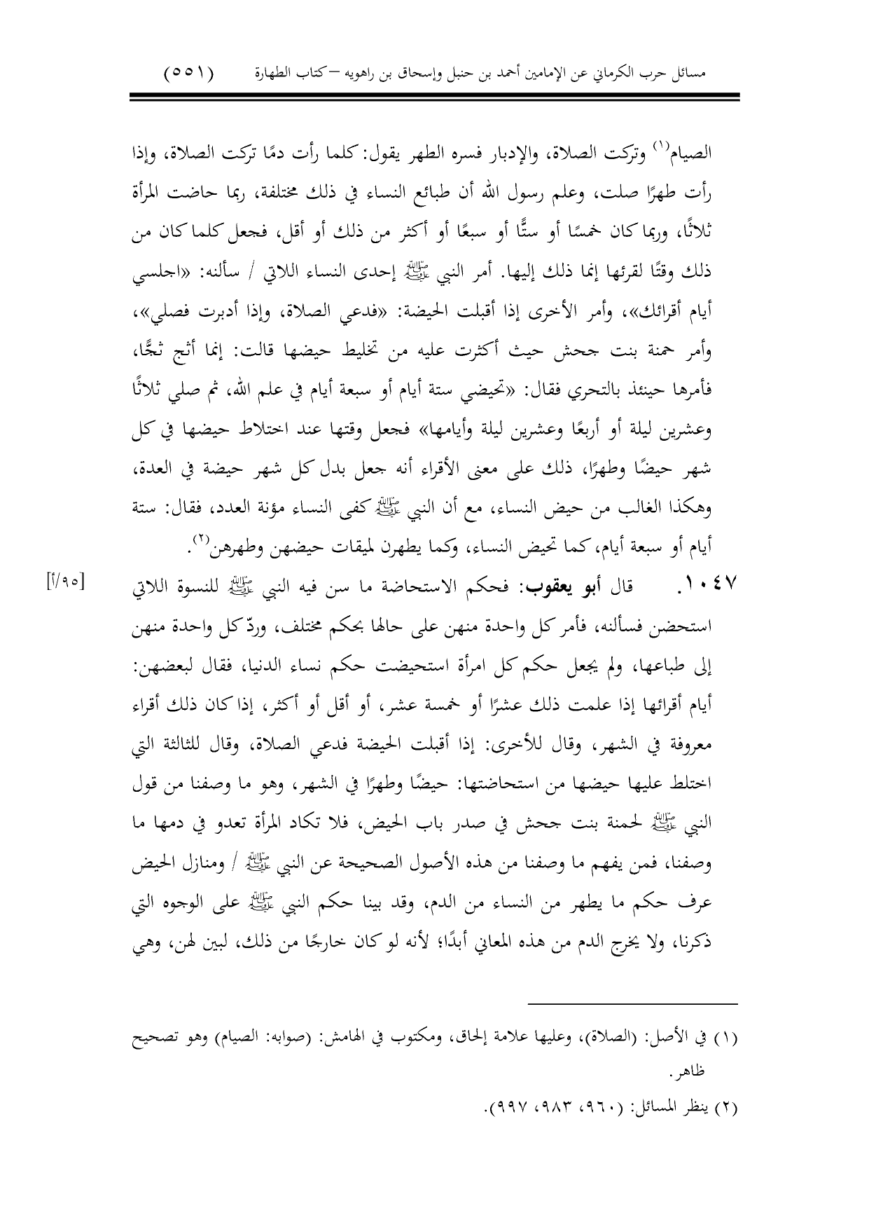 1047 - قال أبو يعقوب: فحكم الاستحاضة ما سن فيه النبي - صلى الله عليه وسلم - للنسوة اللاتي استحضن فسألنه، فأمر كل واحدة منهن على حالها بحكم مختلف، وردّ كل واحدة منهن إلى طباعها، ولم يجعل حكم كل امرأة استحيضت حكم نساء الدنيا، فقال لبعضهن: أيام أقرائها إذا علمت ذلك عشرًا أو خمسة عشر، أو أقل أو أكثر، إذا كان ذلك أقراء معروفة في الشهر، وقال للأخرى: إذا أقبلت الحيضة فدعي الصلاة، وقال للثالثة التي اختلط عليها حيضها من استحاضتها: حيضًا وطهرًا في الشهر، وهو ما وصفنا من قول النبي - صلى الله عليه وسلم - لحمنة بنت جحش في صدر باب الحيض، فلا تكاد المرأة تعدو في دمها ما وصفنا، فمن يفهم ما وصفنا من هذه الأصول الصحيحة عن النبي - صلى الله عليه وسلم - / ومنازل الحيض عرف حكم ما يطهر من النساء من الدم، وقد بينا حكم النبي - صلى الله عليه وسلم - على الوجوه التي ذكرنا، ولا يخرج الدم من هذه المعاني أبدًا؛ لأنه لو كان خارجًا من ذلك، لبين لهن، وهي
