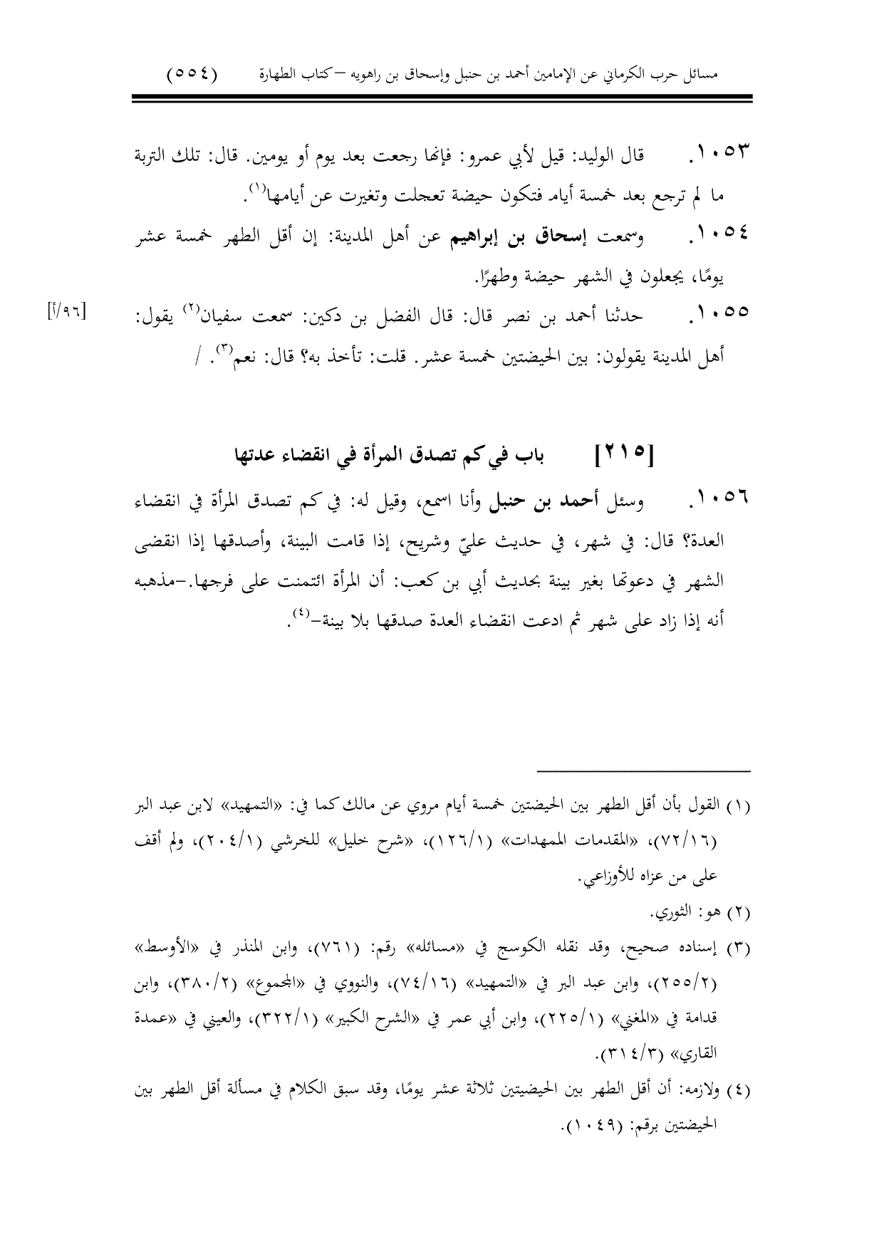 1054 - وسمعت إسحاق بن إبراهيم عن أهل المدينة: إن أقل الطهر خمسة عشر يومًا، يجعلون في الشهر حيضة وطهرًا.