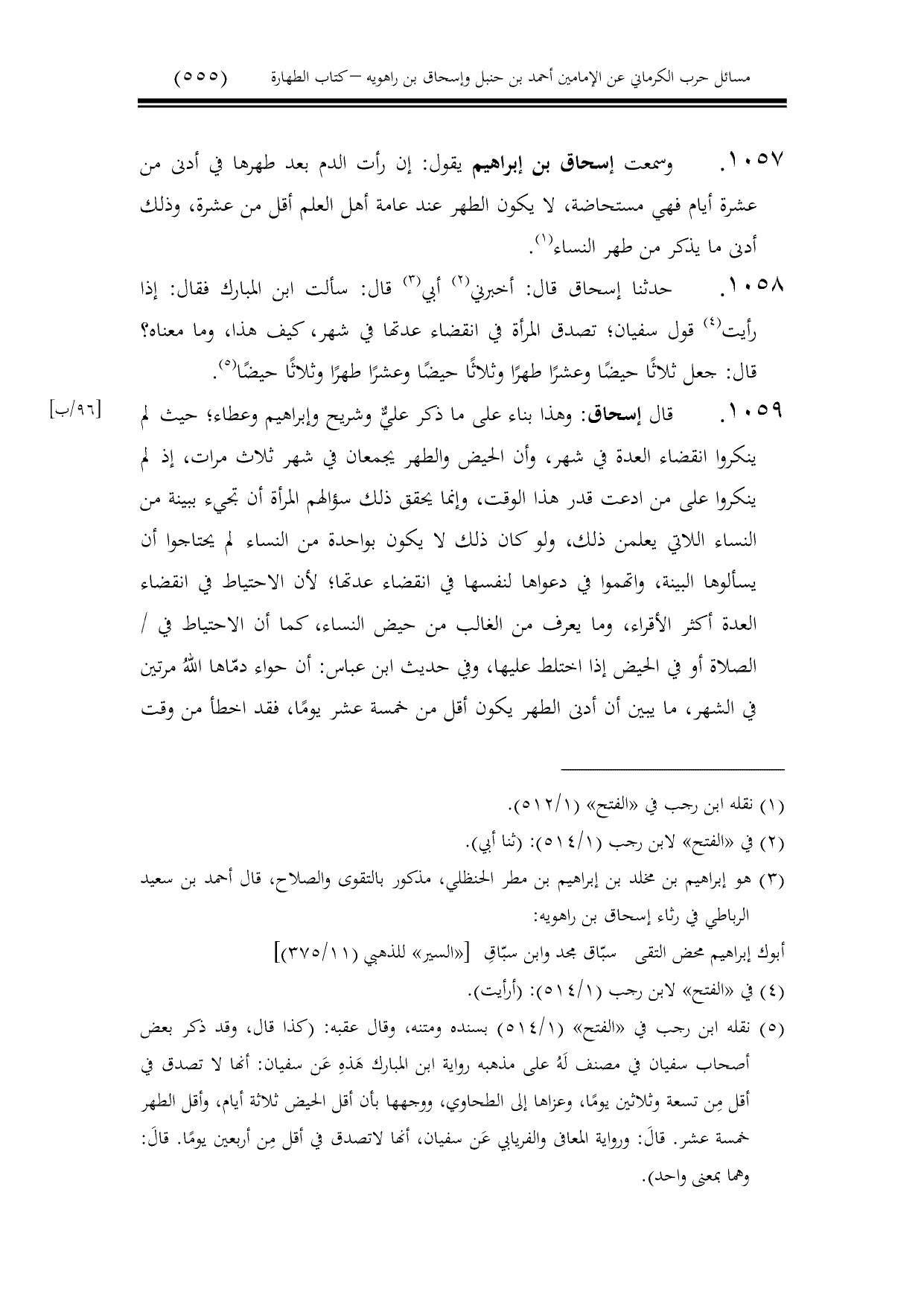 1057 - وسمعت إسحاق بن إبراهيم يقول: إن رأت الدم بعد طهرها في أدنى من عشرة أيام فهي مستحاضة، لا يكون الطهر عند عامة أهل العلم أقل من عشرة، وذلك أدنى ما يذكر من طهر النساء.