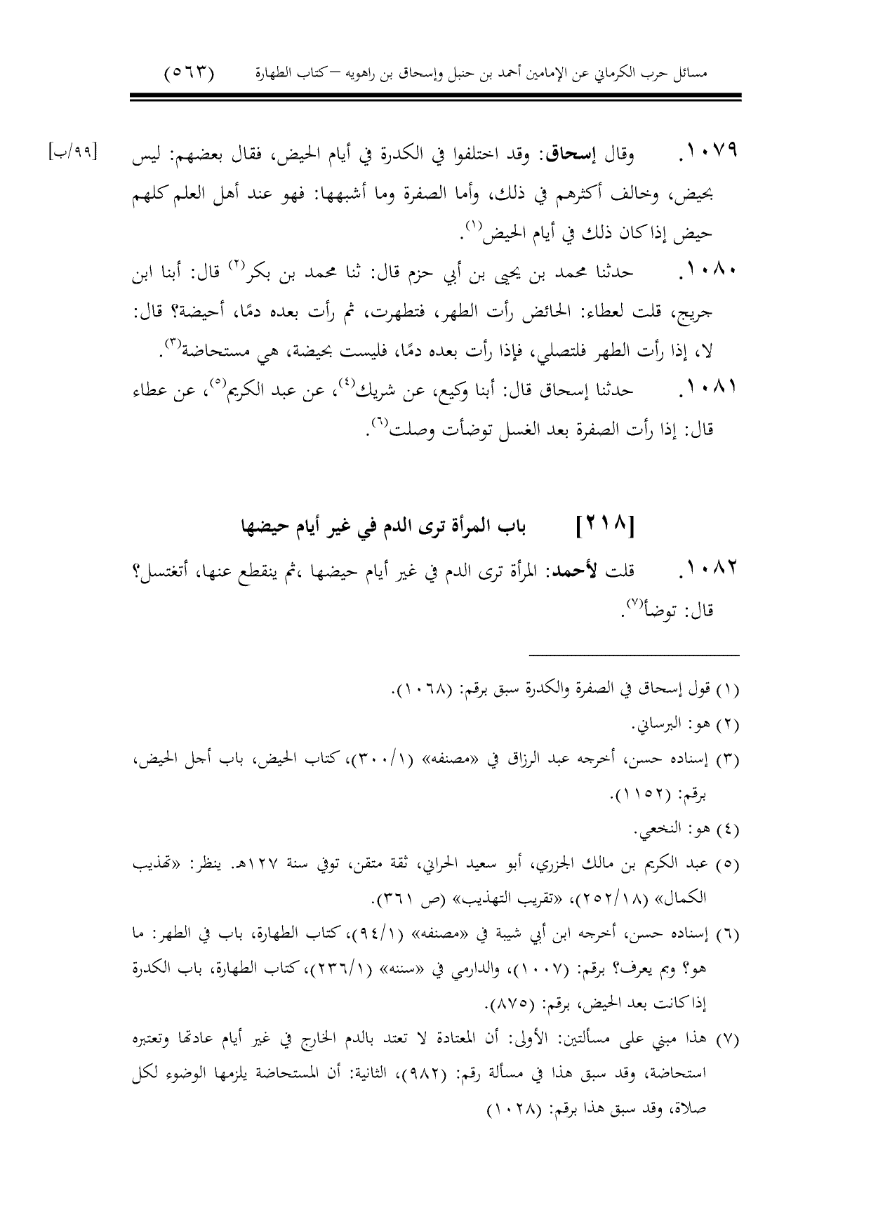 1079 - وقال إسحاق: وقد اختلفوا في الكدرة في أيام الحيض، فقال بعضهم: ليس بحيض، وخالف أكثرهم في ذلك، وأما الصفرة وما أشبهها: فهو عند أهل العلم كلهم حيض إذا كان ذلك في أيام الحيض.