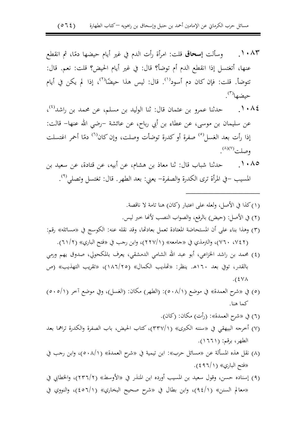 1083 - وسألت إسحاق قلت: امرأة رأت الدم في غير أيام حيضها دمًا، ثم انقطع عنها، أتغتسل إذا انقطع الدم أم توضأ؟ قال: في غير أيام الحيض؟ قلت: نعم. قال: تتوضأ. قلت: فإن كان دم أسود. قال: ليس هذا حيضًا، إذا لم يكن في أيام حيضها.