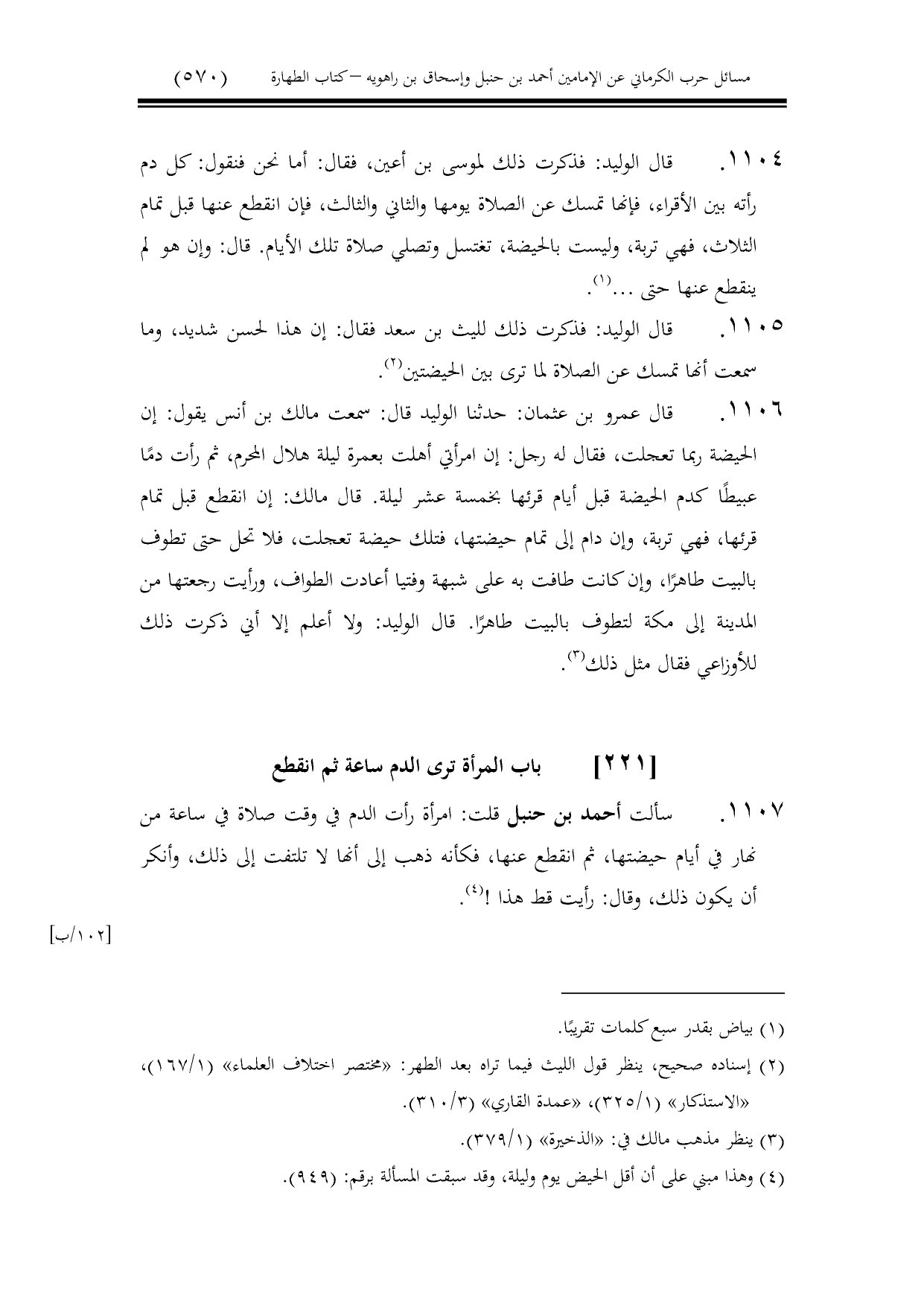 1107 - سألت أحمد بن حنبل قلت: امرأة رأت الدم في وقت صلاة في ساعة من نهار في أيام حيضتها، ثم انقطع عنها، فكأنه ذهب إلى أنها لا تلتفت إلى ذلك، وأنكر أن يكون ذلك، وقال: رأيت قط هذا!.