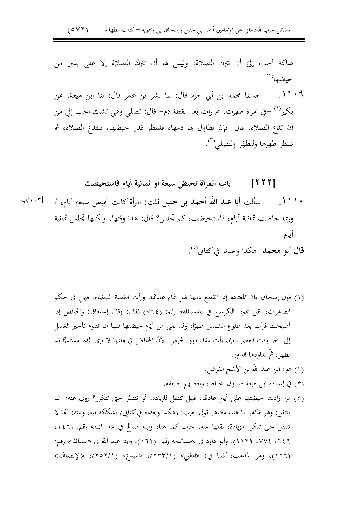 1110 - سألت أبا عبد الله أحمد بن حنبل قلت: امرأة كانت تحيض سبعة أيام، / وربما حاضت ثمانية أيام، فاستحيضت، كم تجلس؟ قال: هذا وقتها، ولكنها تجلس ثمانية أيام