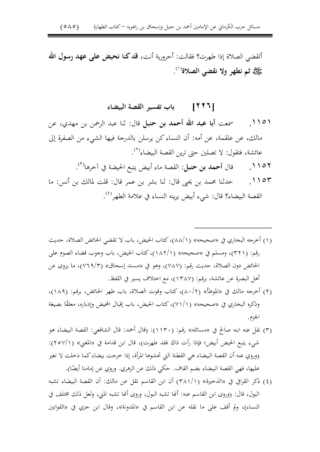 1151 - سمعت أبا عبد الله أحمد بن حنبل قال: ثنا عبد الرحمن بن مهدي، عن مالك، عن علقمة، عن أمه: أن النساء كن يرسلن بالدرجة فيها الشيء من الصفرة إلى عائشة، فتقول: لا تصلين حتى ترين القصة البيضاء.