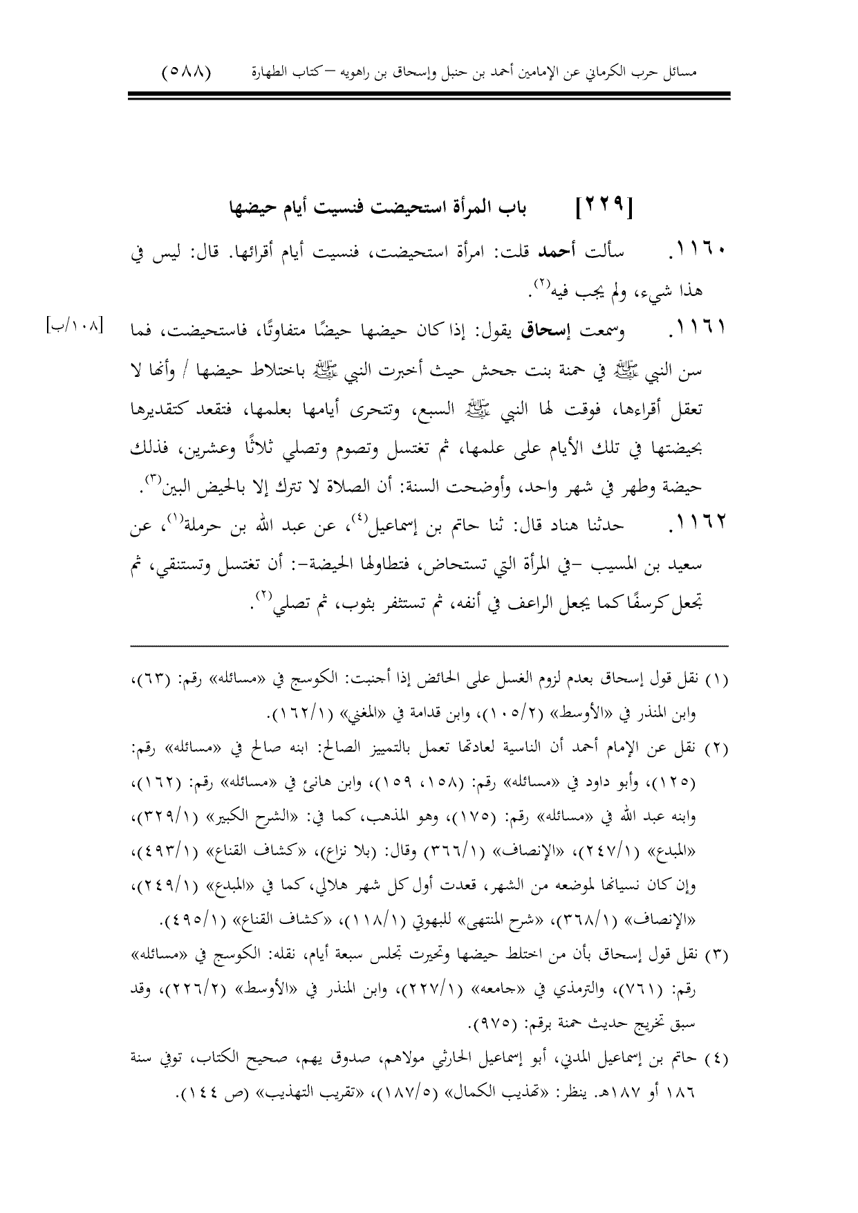 1161 - وسمعت إسحاق يقول: إذا كان حيضها حيضًا متفاوتًا، فاستحيضت، فما سن النبي - صلى الله عليه وسلم - في حمنة بنت جحش حيث أخبرت النبي - صلى الله عليه وسلم - باختلاط حيضها / وأنها لا تعقل أقراءها، فوقت لها النبي - صلى الله عليه وسلم - السبع، وتتحرى أيامها بعلمها، فتقعد كتقديرها بحيضتها في تلك الأيام على علمها، ثم تغتسل وتصوم وتصلي ثلاثًا وعشرين، فذلك حيضة وطهر في شهر واحد، وأوضحت السنة: أن الصلاة لا تترك إلا بالحيض البين.