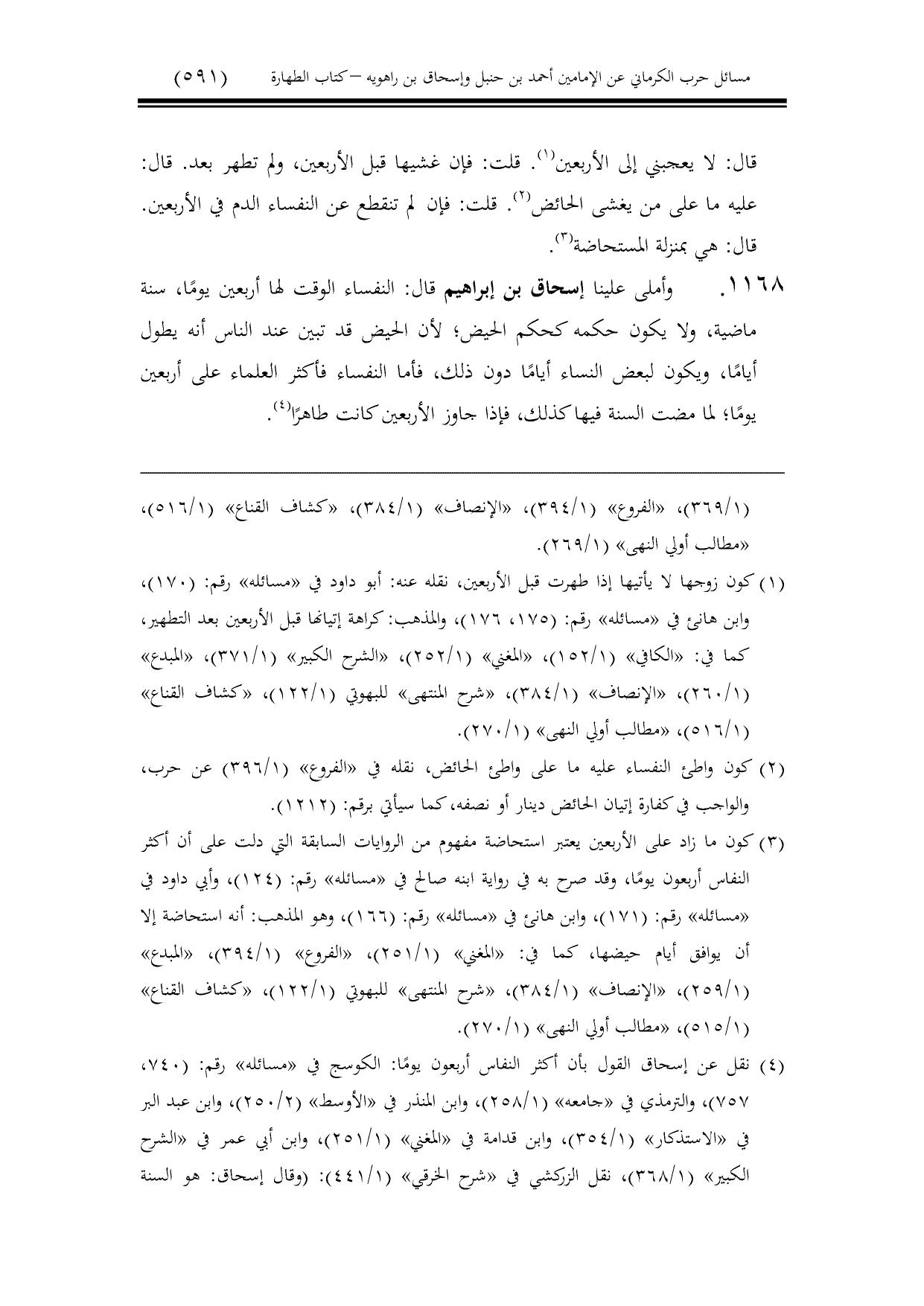 1168 - وأملى علينا إسحاق بن إبراهيم قال: النفساء الوقت لها أربعين يومًا، سنة ماضية، ولا يكون حكمه كحكم الحيض؛ لأن الحيض قد تبين عند الناس أنه يطول أيامًا، ويكون لبعض النساء أيامًا دون ذلك، فأما النفساء فأكثر العلماء على أربعين يومًا؛ لما مضت السنة فيها كذلك، فإذا جاوز الأربعين كانت طاهرًا.