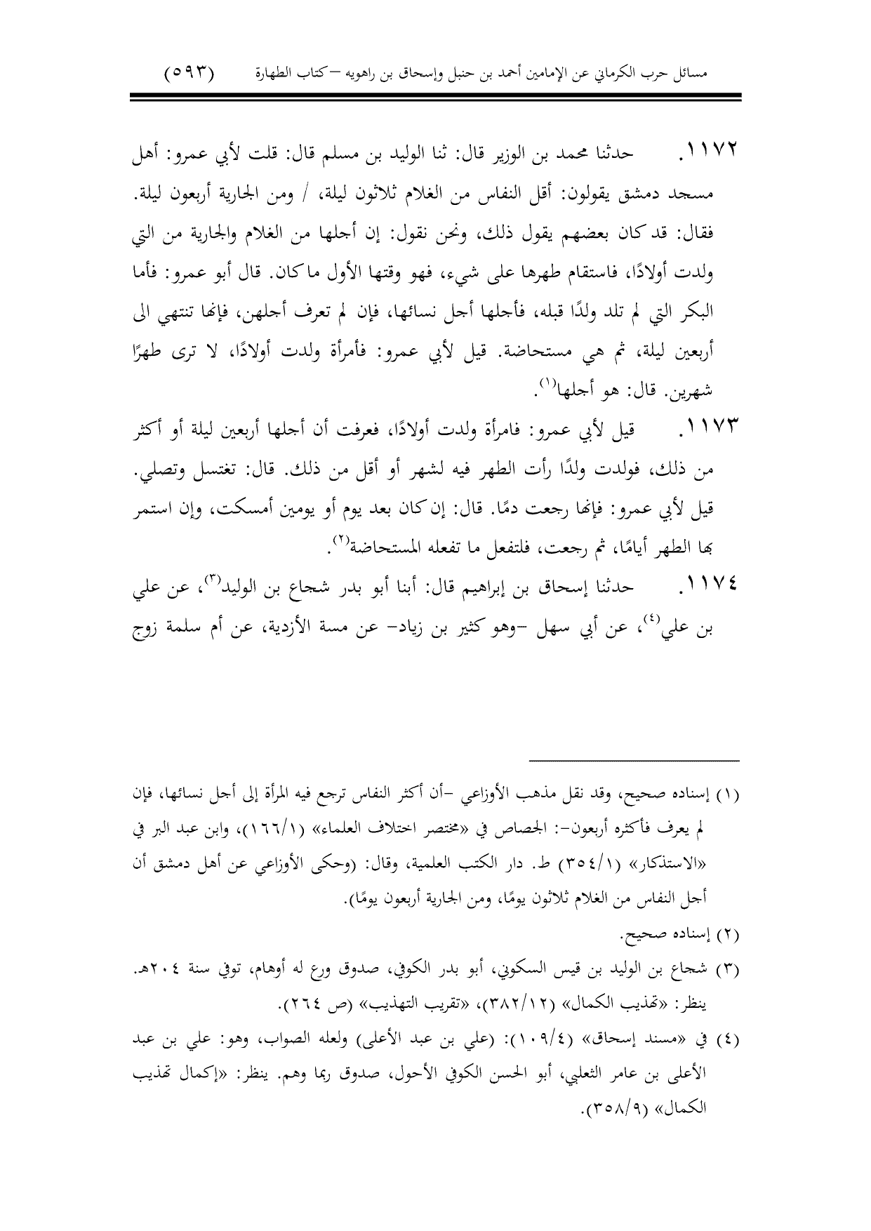 1172 - حدثنا محمد بن الوزير قال: ثنا الوليد بن مسلم قال: قلت لأبي عمرو: أهل مسجد دمشق يقولون: أقل النفاس من الغلام ثلاثون ليلة، / ومن الجارية أربعون ليلة. فقال: قد كان بعضهم يقول ذلك، ونحن نقول: إن أجلها من الغلام والجارية من التي ولدت أولادًا، فاستقام طهرها على شيء، فهو وقتها الأول ما كان. قال أبو عمرو: فأما البكر التي لم تلد ولدًا قبله، فأجلها أجل نسائها، فإن لم تعرف أجلهن، فإنها تنتهي الى أربعين ليلة، ثم هي مستحاضة. قيل لأبي عمرو: فأمرأة ولدت أولادًا، لا ترى طهرًا شهرين. قال: هو أجلها.