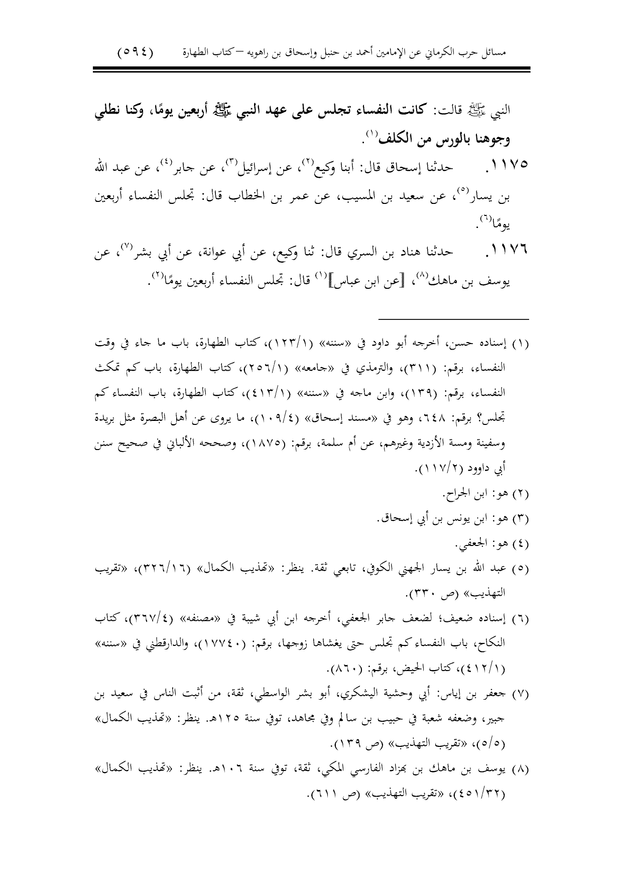 1175 - حدثنا إسحاق قال: أبنا وكيع، عن إسرائيل، عن جابر، عن عبد الله بن يسار، عن سعيد بن المسيب، عن عمر بن الخطاب قال: تجلس النفساء أربعين يومًا.
