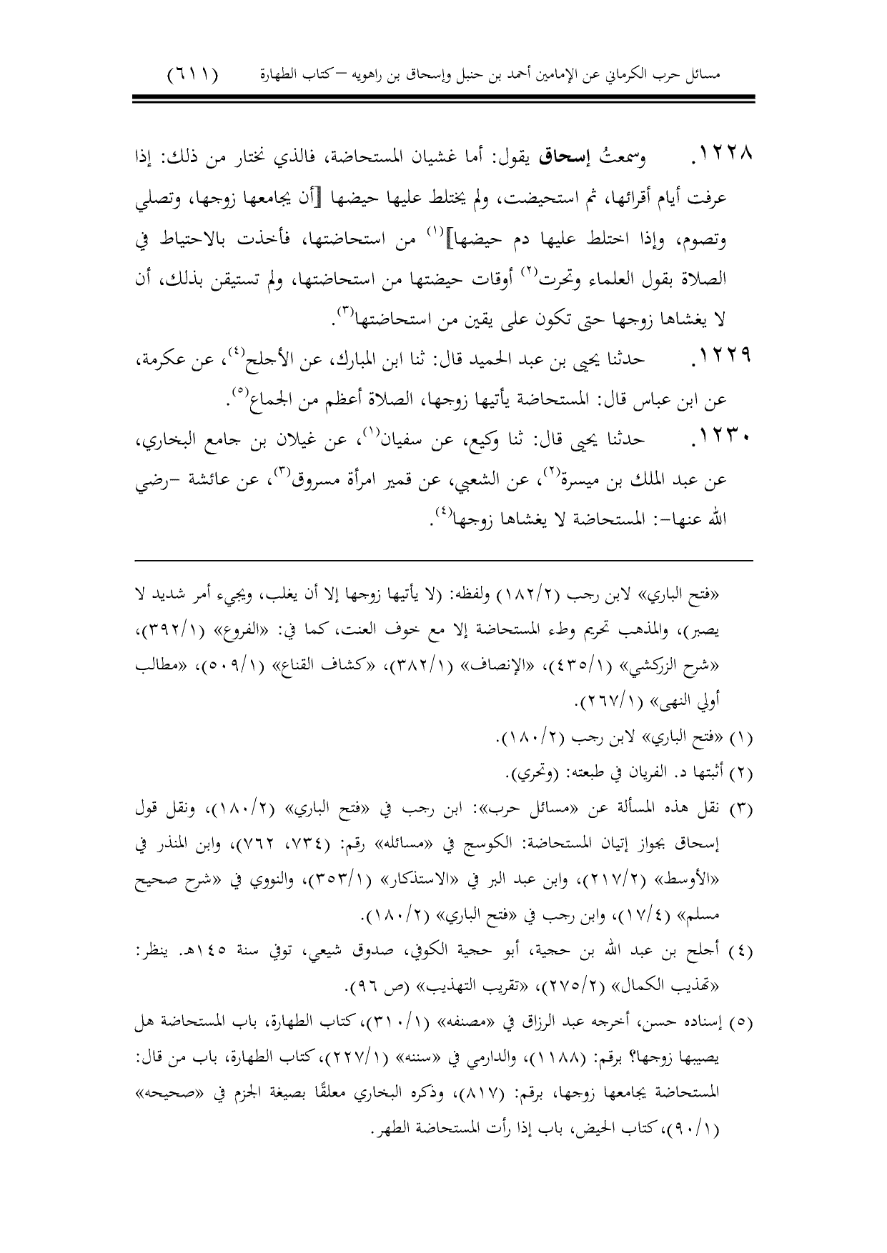 1228 - وسمعتُ إسحاق يقول: أما غشيان المستحاضة، فالذي نختار من ذلك: إذا عرفت أيام أقرائها، ثم استحيضت، ولم يختلط عليها حيضها [أن يجامعها زوجها، وتصلي وتصوم، وإذا اختلط عليها دم حيضها] من استحاضتها، فأخذت بالاحتياط في الصلاة بقول العلماء وتحرت أوقات حيضتها من استحاضتها، ولم تستيقن بذلك، أن لا يغشاها زوجها حتى تكون على يقين من استحاضتها.