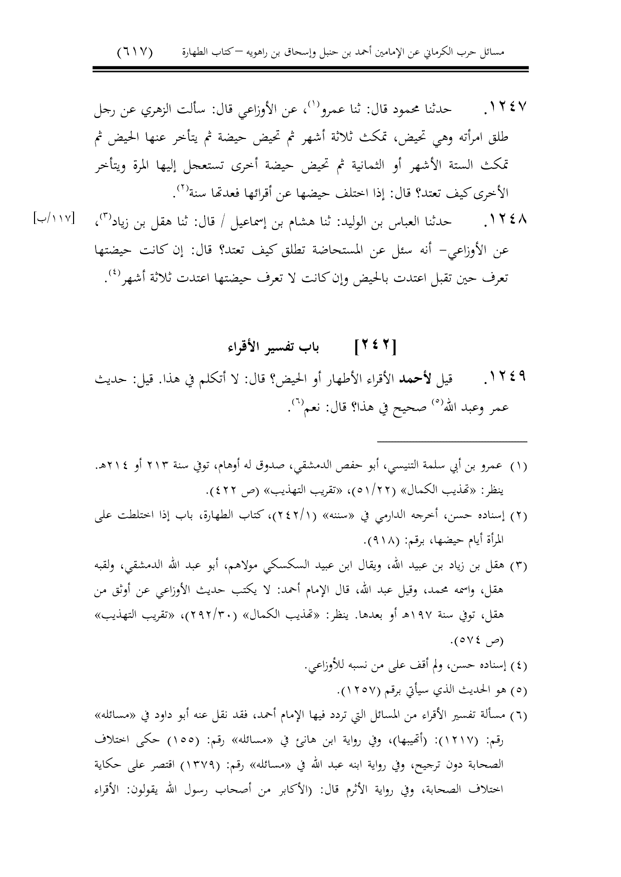 1249 - قيل لأحمد الأقراء الأطهار أو الحيض؟ قال: لا أتكلم في هذا. قيل: حديث عمر وعبد الله صحيح في هذا؟ قال: نعم.