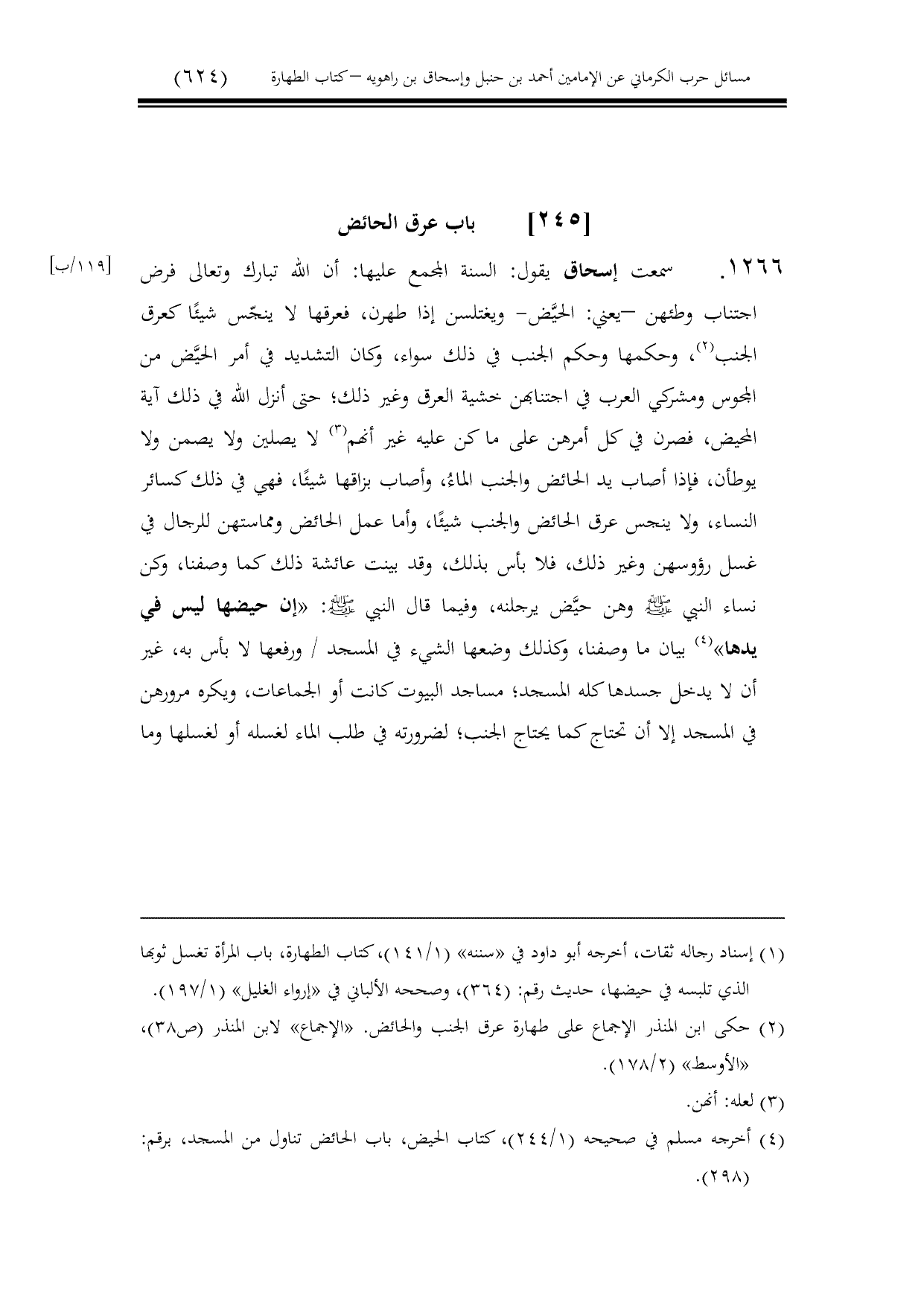1266 - سمعت إسحاق يقول: السنة المجمع عليها: أن الله تبارك وتعالى فرض اجتناب وطئهن -يعني: الحيَّض- ويغتلسن إذا طهرن، فعرقها لا ينجّس شيئًا كعرق الجنب، وحكمها وحكم الجنب في ذلك سواء، وكان التشديد في أمر الحيَّض من المجوس ومشركي العرب في اجتنابهن خشية العرق وغير ذلك؛ حتى أنزل الله في ذلك آية المحيض، فصرن في كل أمرهن على ما كن عليه غير أنهم لا يصلين ولا يصمن ولا يوطأن، فإذا أصاب يد الحائض والجنب الماءُ، وأصاب بزاقها شيئًا، فهي في ذلك كسائر النساء، ولا ينجس عرق الحائض والجنب شيئًا، وأما عمل الحائض ومماستهن للرجال في غسل رؤوسهن وغير ذلك، فلا بأس بذلك، وقد بينت عائشة ذلك كما وصفنا، وكن نساء النبي - صلى الله عليه وسلم - وهن حيَّض يرجلنه، وفيما قال النبي - صلى الله عليه وسلم -: «إن حيضها ليس في يدها» بيان ما وصفنا، وكذلك وضعها الشيء في المسجد / ورفعها لا بأس به، غير أن لا يدخل جسدها كله المسجد؛ مساجد البيوت كانت أو الجماعات، ويكره مرورهن في المسجد إلا أن تحتاج كما يحتاج الجنب؛ لضرورته في طلب الماء لغسله أو لغسلها وما