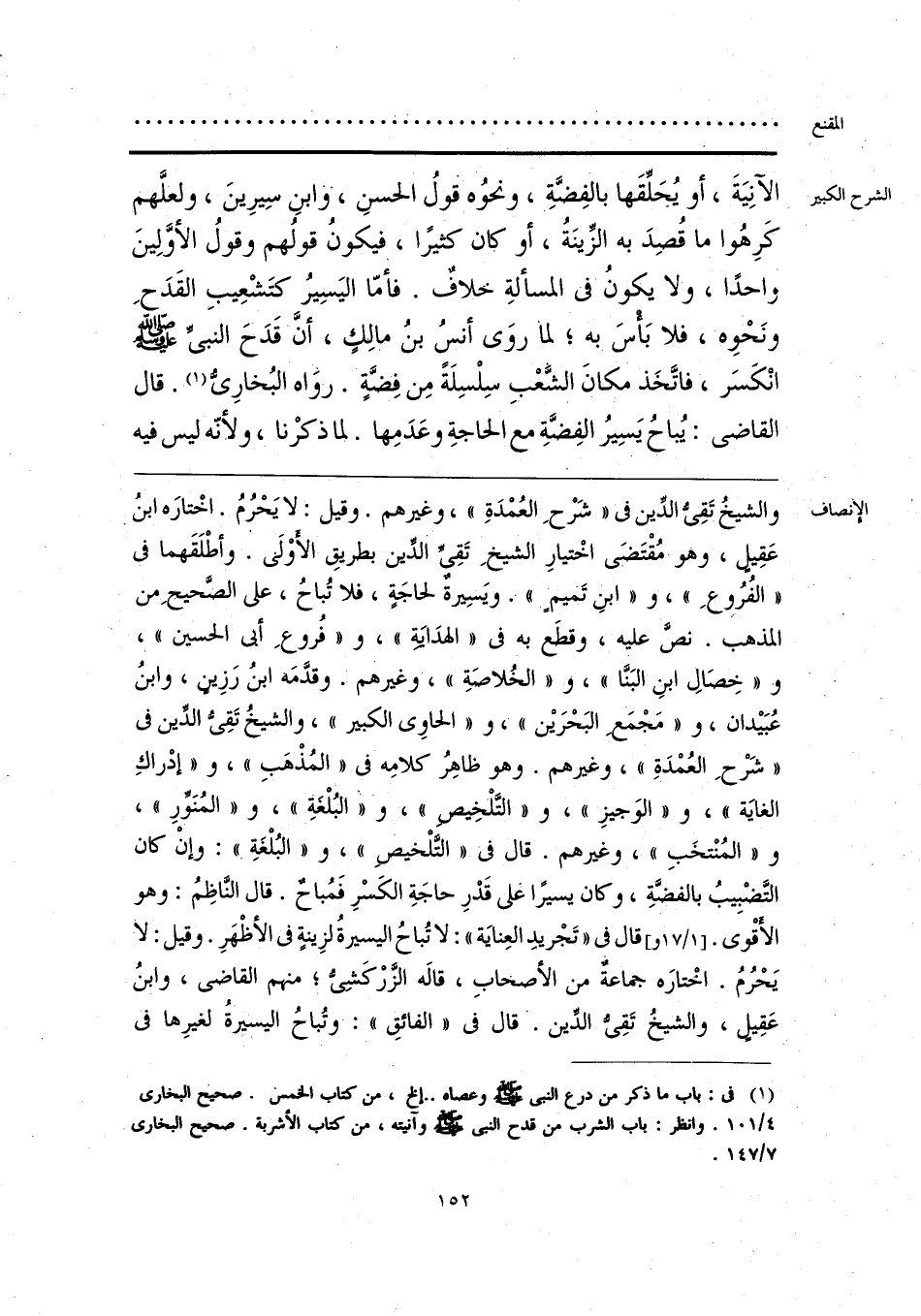 والشيخُ تَقِيُّ الدِّين في «شَرْحِ العُمْدَةِ»، وغيرهم. وقيل: لا يَحْرُمُ. اخْتارَه ابنُ عَقِيل، وهو مُقْتَضىَ اخْتيارِ الشيخِ تَقِي الدين بطريقِ الأوْلَى. وأطْلَقَهما في «الفُرُوعِ»، و «ابنِ تَميم». ويَسِيرة لحاجَةٍ، فلا تُباحُ، على الصَّحيح من المذهب. نصَّ عليه، وقطَع به في «الهدَاية»، و «فُروعِ أبي الحسين»، و «خِصَالِ ابنِ البَنَّا»، و «الخُلاصَةِ»، وغيرهم. وقدَّمه ابنُ رَزِين، وابنُ عُبَيدان، و «مَجْمَع البَحْرَين»، و «الحاوي الكبير»، والشيخُ تَقِيُّ الدين في «شَرْحِ العُمْدَةِ»، وغيرهم. وهو ظاهِرُ كلامِه في «المُذْهَبِ»، و «إدْراكِ الغايَة»، و «الوَجيزِ»، و «التَّلْخِيص»، و «البُلْغةِ»، و «المُنَوِّرِ»، و «المُنْتخَبِ»، وغيرهم. قال في «التَّلْخيص»، و «البُلْغَةِ»: وإنْ كان التَّضْبِيبُ بالفضَّةِ، وكان يسيرًا على قَدْرِ حاجَةِ الكَسْرِ فَمُباحٌ. قال الناظِمُ: وهو الأقْوى. قال في «تَجْريد العِنايَة»: لا تُباحُ اليسيرةُ لزِينةٍ في الأظْهَرِ. وقيل: لا يَحْرُمُ. اخْتارَه جماعة من الأصحابِ، قاله الزَّرْكَشِي؛ منهم القاضي، وابنُ عَقِيل، والشيخُ تَقِي الدِّين. قال في «الفائقِ»: وتُباحُ اليسيرةُ لغيرِها في