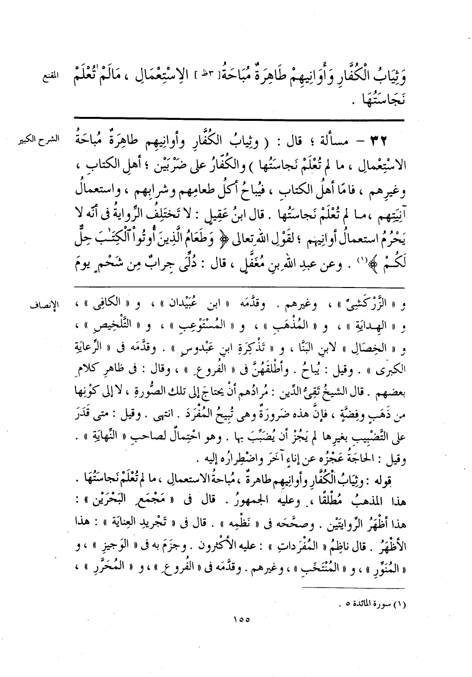 قوله: وثِيَابُ الْكُفَّارِ وأوانِيهِم طاهرةٌ، مُباحةُ الاستعمالِ، ما لم تُعْلَمْ نَجاسَتُهَا. هذا المذهبُ مُطْلقًا، وعليه الجمهورُ. قال في «مَجْمَعِ البَحْرَين»: هذا أظْهَرُ الرِّوايتَين. وصحَّحَه في «نَظْمِه». قال في «تَجْريدِ العِنايَة»: هذا الأظْهَرُ. قال ناظِمُ «المُفْرَداتِ»: عليه الأكْثرون. وجزَمَ به في «الوَجيزِ»، و «المنَوِّرِ»، و «المُنْتَخَبِ»، وغيرهم. وقدَّمَه في «الفُروعَ»، و «المُحَرَّرِ»،