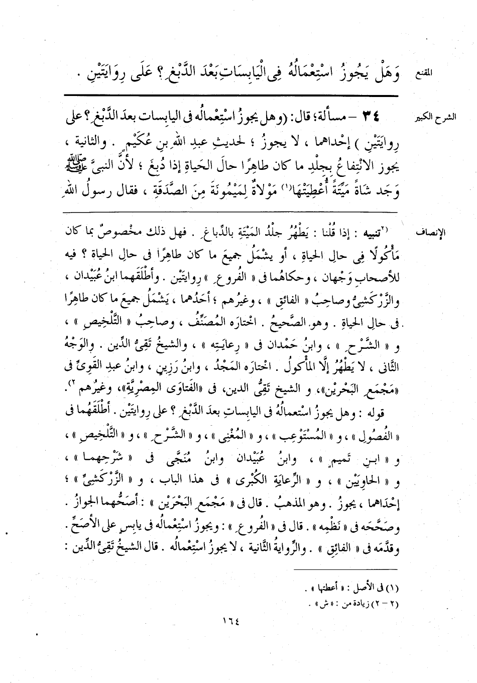 قوله: وهل يجوزُ اسْتعمِاله في اليابِساتِ بعدَ الدَّبْغِ؛ على رِوايتَين. أطْلَقَهُما في «الفُصولِ»، و «المُستوعِب»، و «المُغْنِي»، و «الشَّرْحِ»، و «التَّلْخِيصِ»، و «ابنِ تَميمٍ»، وابنُ عُبَيدان وابنُ منجى في «شَرْحِهما»، و «الحاويَين»، و «الرِّعايَة الكُبْرى» في هذا الباب، و «الزَّرْكَشِيِّ»، إحْدَاهما، يجوزُ. وهو المذهبُ. قال في «مَجْمَعِ البَحْرَين»: أصَحُّهما الجوازُ. وصَحَّحَه في «نَظْمِه». قال في «الفُروعِ»: ويجوزُ اسْتِعْماله في يابِس على الأصَحِّ. وقدَّمَه في «الفائِقِ». والرِّوايةُ الثَّانية، لا يجوزُ اسْتِعْمالُه. قال الشيخُ تَقِيُّ الدِّين:
