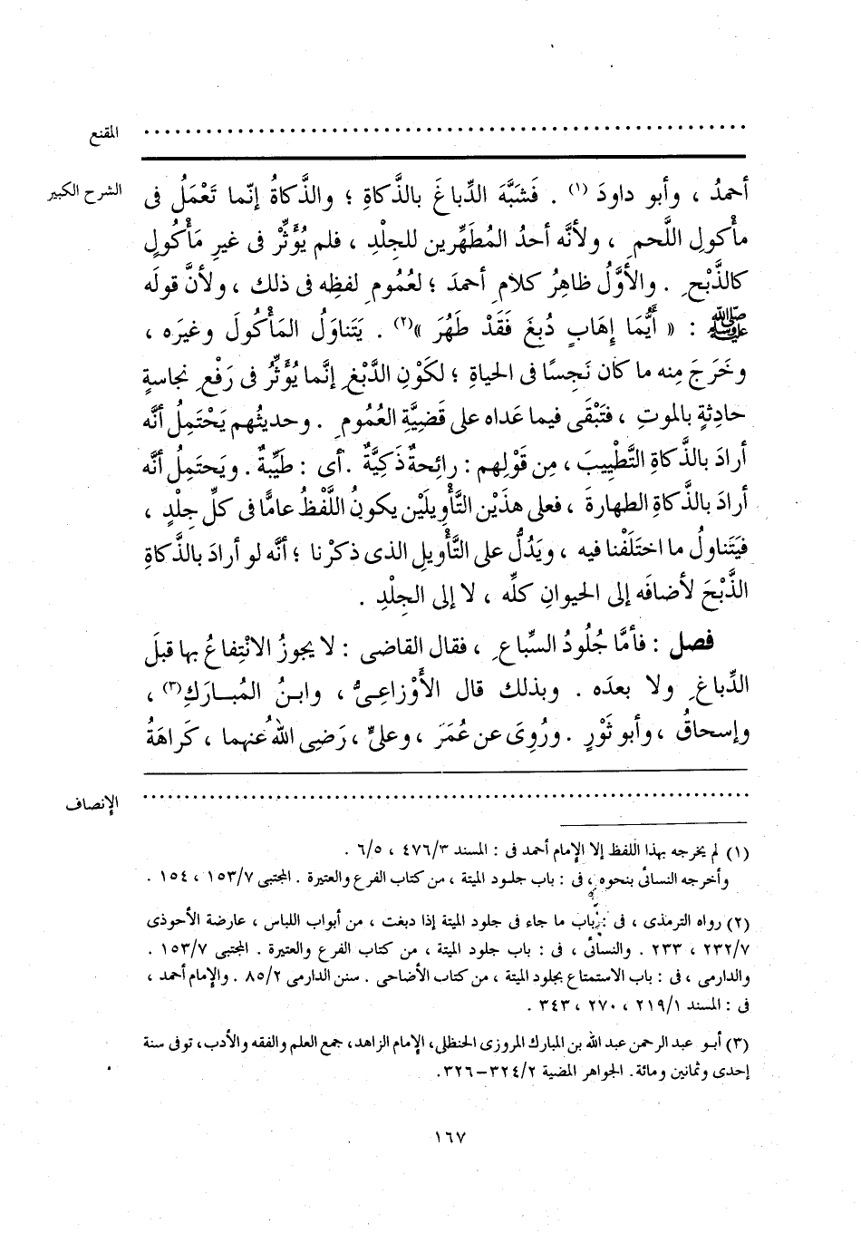 (¬2) رواه الترمذي، في: باب ما جاء في جلود الميتة إذا دبغت، من أبواب اللباس، عارضة الأحوذي 7/ 232، 233. والنسائي، في: باب جلود الميته، من كتاب الفرع والعتيرة. المجتبى 7/ 153. والدارمي، في: باب الاستمتاع بجلود الميتة، من كتاب الأضاحي. سنن الدارمي 2/ 85. والإمام أحمد، في: المسند 1/ 219، 270، 343.