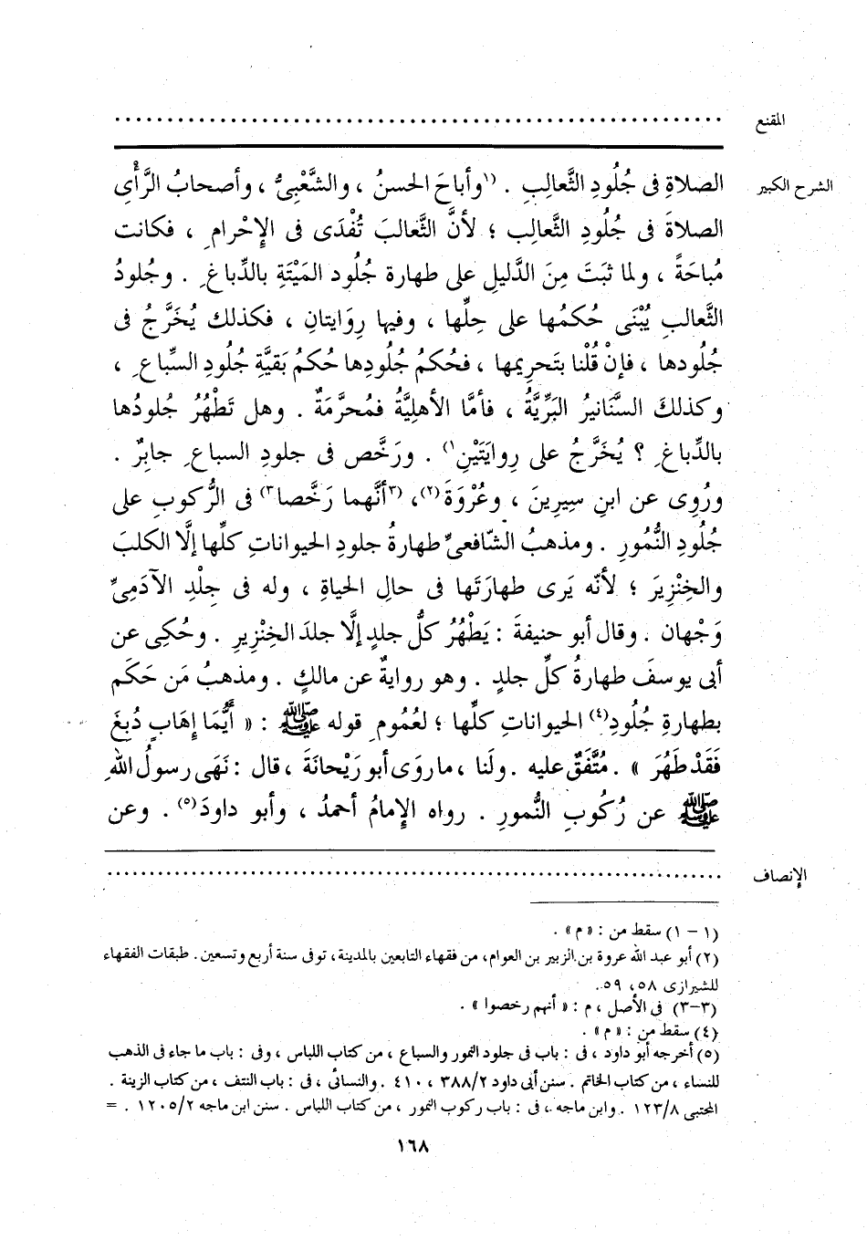 الصلاةِ في جُلُودِ الثَّعالِبِ. [وأباحَ الحسنُ، والشَّعْبِيُّ، وأصحابُ الرَّأي الصلاةَ في جُلُودِ الثَّعالِب؛ لأنَّ الثَّعالبَ تُفْدَى في الإِحْرامِ، فكانت مُباحَةً، ولما ثبَتَ مِنَ الدَّليلِ على طهارة جُلُود المَيتَةِ بالدِّباغِ. وجُلودُ الثَّعالبِ يُبْنَى حُكمُها على حِلِّها، وفيها رِوَايتانِ، فكذلك يُخَرَّجُ في جُلُودها، فإنْ قُلْنا بتَحرِيمها، فحُكمُ جُلُودِها حُكمُ بَقيَّةِ جُلُودِ السِّباعِ، وكذلكَ السَّنانيرُ البَرِّيَّةُ، فأمَّا الأهلِيَّةُ فمُحرَّمَةٌ. وهل تَطْهُرُ جُلودُها بالدِّباغِ؟ يُخَرَّجُ على رِوايَتَينِ] (¬1). ورَخَّص في جلودِ السباعِ جابِرٌ. ورُوى عن ابنِ سِيرِينَ، وعُرْوَةَ (¬2)، [أنَّهما رَخَّصا] (¬3) في الرُّكوبِ على جُلُودِ النُّمُورِ. ومذهبُ الشّافعيِّ طهارةُ جلودِ الحيواناتِ كلها إلَّا الكلبَ والخِنْزِيرَ؛ لأنّه يَرى طهارَتَها في حالِ الحياةِ، وله في جِلْدِ الآدَمِيِّ وَجْهان. وقال أبو حنيفةَ: يَطْهُرُ كلُّ جلدٍ إلَّا جلدَ الخِنْزِيرِ. وحُكِي عن أبي يوسفَ طهارةُ كلِّ جلدٍ. وهو روايةٌ عن مالكٍ. ومذهبُ مَن حَكَم بطهارةِ جلُودِ (¬4) الحيواناتِ كلها؛ لعُمُومِ قوله - صلى الله عليه وسلم -: «أيمَا إِهَابٍ دُبغ فَقَدْ طَهُرَ». مُتَّفَق عليه. ولَنا، ما روَى أبو رَيحانَةَ، قال: نَهَى رسولُ اللهِ - صلى الله عليه وسلم - عن ركُوبِ النُّمورِ. رواه الإِمامُ أحمدُ، وأبو داودَ (¬5). وعن