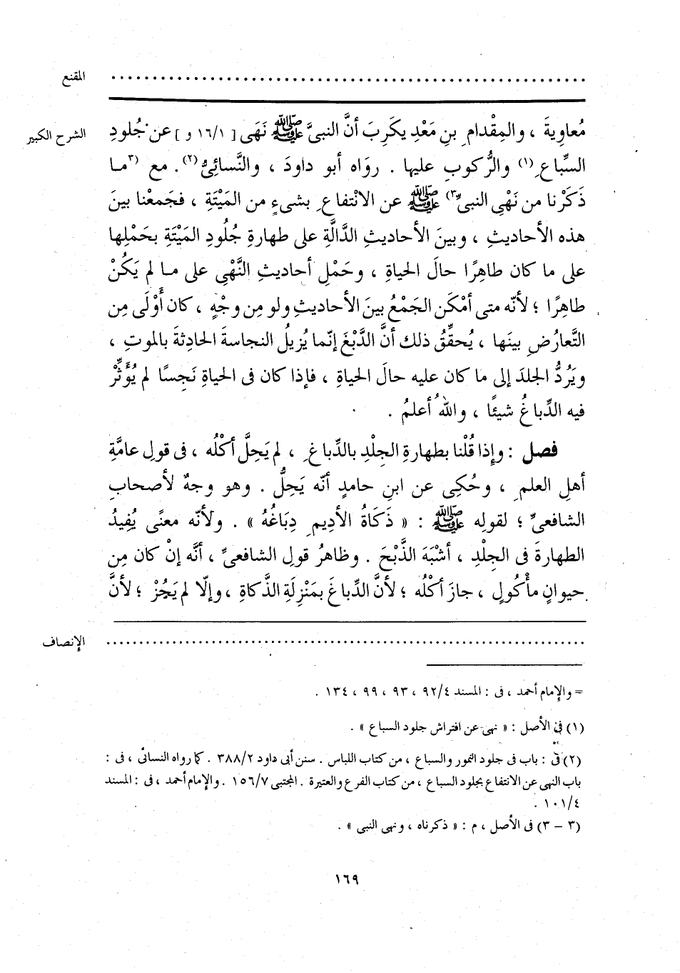 مُعاويةَ، والمِقْدامِ بنِ مَعْدِ يكَرِبَ أنَّ النبيَّ - صلى الله عليه وسلم - نَهَى عنْ جُلودِ السِّباعِ (¬1) والرُّكوبِ عليها. روَاه أبو داودَ، والنَّسائِي (¬2). مع [ما ذَكَرْنا من نَهْي النبيِّ] (¬3) - صلى الله عليه وسلم - عن الانْتفاعِ بشيءٍ من المَيتَةِ، فجَمعْنا بينَ هذه الأحاديثِ، وبينَ الأحاديثِ الدَّالَّةِ على طهارةِ جُلُودِ المَيتَةِ بحَمْلِها على ما كان طاهِرًا حال الحياةِ، وحَمْلِ الأحاديثِ النَّهْي على ما لم يَكُنْ طاهِرًا، لأنّه متى أمْكَن الجَمْعُ بينَ الأحاديثِ ولو مِن وجه، كان أَوْلَى مِن التَّعارُضِ بينَها، يُحقِّقُ ذلك أنَّ الدَّبْغَ إنّما يُزيلُ النجاسةَ الحادِثةَ بالموتِ، ويَرُدُّ الجلدَ إلى ما كان عليه حال الحياةِ، فإذا كان في الحياةِ نَجِسًا لم يُؤَثِّرْ فيه الدِّباغُ شيئًا، واللهُ أعلمُ.