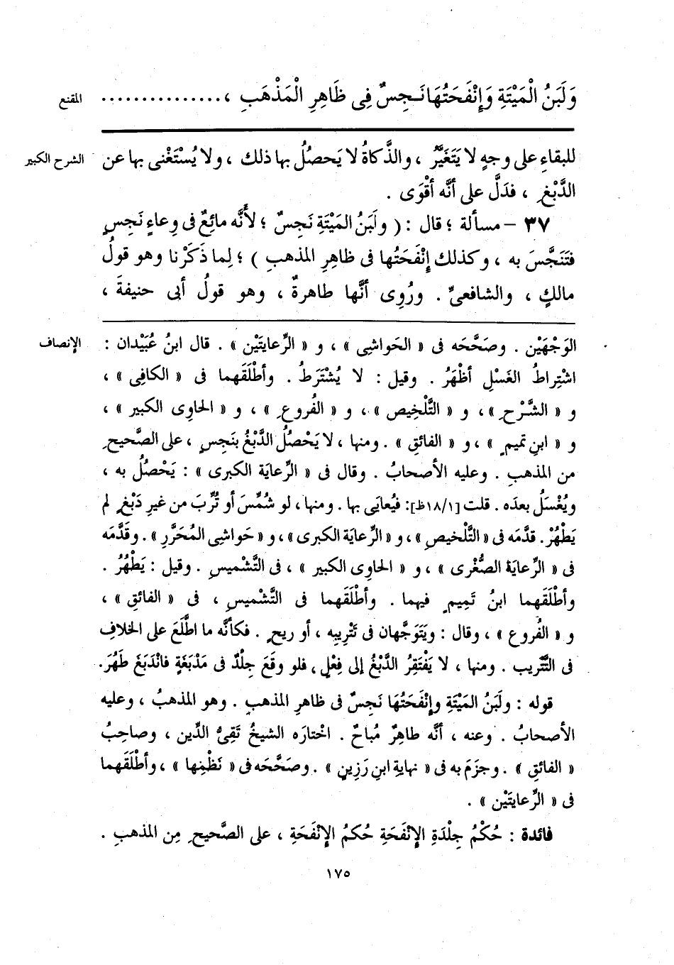 الوَجْهَين. وصَحَّحَه في «الحَواشِي»، و «الرِّعايتَين». قال ابنُ عُبَيدان: اشْتِراطُ الغَسْلِ أظْهَرُ. وقيل: لا يُشْتَرَطُ. وأطْلَقَهما في «الكافِي»، و «الشَّرْحِ»، و «التَّلْخِيص»، و «الفُروعِ»، و «الحاوي الكبير»، و «ابنِ تميمٍ»، و «الفائقِ». ومنها، لا يَحْصُل الدَّبْغُ بنَجِسٍ، على الصَّحيحِ من المذهبِ. وعليه الأصحابُ. وقال في «الرِّعايَة الكبرى»: يَحْصُلُ به، ويُغْسَلُ بعدَه. قلت: فيُعايَى بها. ومنها، لو شُمِّسَ أو تُرِّبَ من غيرِ دَبْغٍ لم يَطْهُرْ. قدَّمَه في «التَّلْخيصِ»، و «الرِّعايَة الكبرى»، و «حَواشِي المُحَرَّرِ». وقَدَّمَه في «الرِّعايَة الصُّغْرى»، و «الحاوي الكبير»، في التَّشْميسِ. وقيل: يَطْهُرُ. وأطْلَقَهما ابنُ تَمِيمٍ فيهما. وأطْلَقَهما في التَّشْميسِ، في «الفائقِ»، و «الفُروع»، وقال: ويَتَوَجَّهان في تَتْرِيبِه، أو ريحٍ. فكأنَّه ما اطَّلَعَ على الخلافِ في التَّتريب. ومنها، لا يَفْتَقِرُ الدَّبْغُ إلى فِعْلٍ، فلو وقَعَ جِلْدً في مَدْبَغةٍ فانْدَبَغ طَهُرَ.