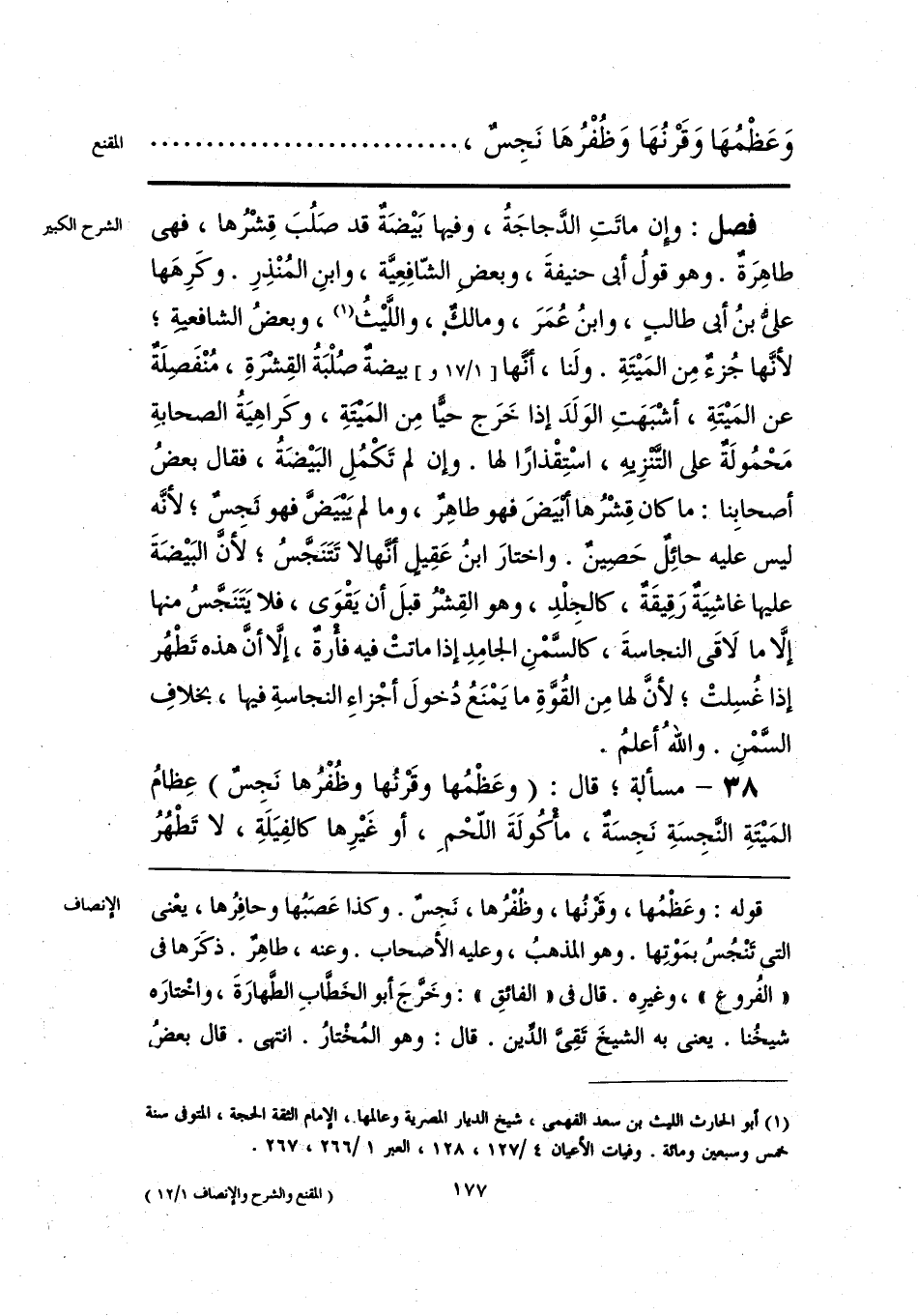 قوله: وعَظْمُها، وقَرْنُها، وظُفْرُها، نَجسٌ. وكذا عَصَبُها وحافِرُها، يعْني التي تَنْجُسُ بمَوْتِها. وهو المذهبُ، وعليه الأصحاب. وعنه، طاهِرٌ. ذكَرَها في «الفُروع»، وغيرِه. قال في «الفائقِ»: وخَرَّجَ أبو الخَطَّابِ الطَّهارَةَ، واخْتارَه شيخُنا. يعني به الشيخَ تَقِيِّ الدِّين. قال: وهو المُخْتارُ. انتهى. قال بعضُ