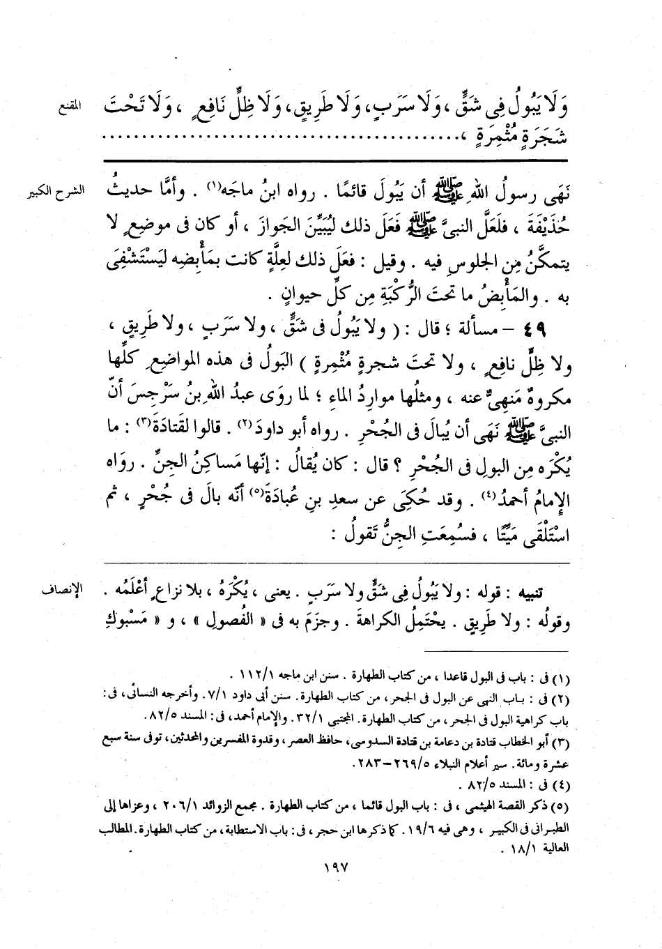 وَلَا يَبُولُ فِىِ شَقٍّ، وَلَا سَرَبٍ، وَلَا طَرِيقٍ، وَلَا ظِلٍّ نَافِعٍ، وَلَا تَحْتَ شَجَرَةٍ مُثْمِرةٍ،