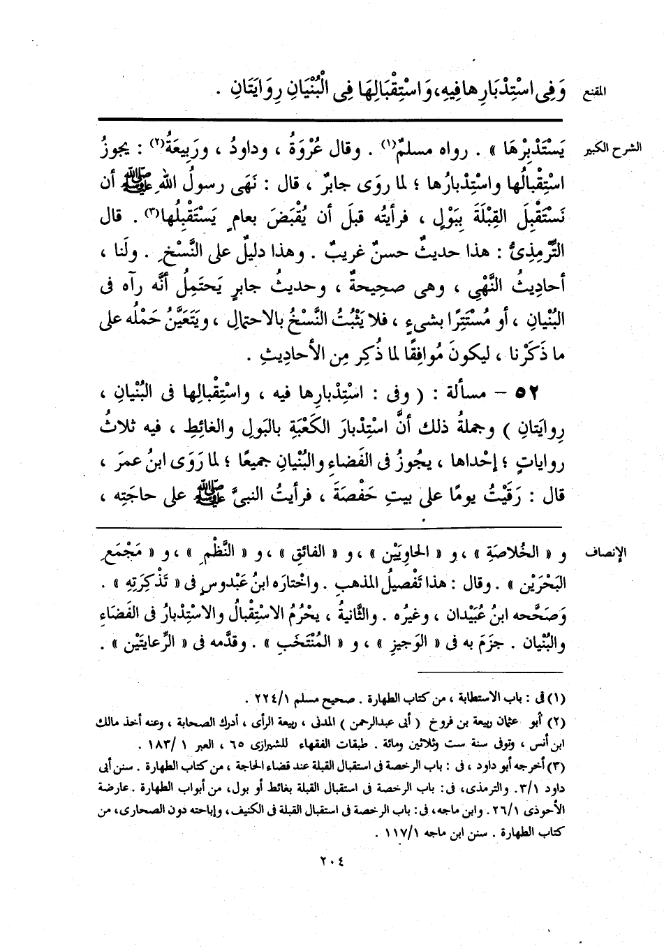 و «الخُلاصَةِ»، و «الحاويَيْن»، و «الفائقِ»، و «النظْمِ»، و «مَجْمَع البَحْرَين». وقال: هذا تَفْصيلُ المذهبِ. واخْتارَه ابنُ عَبْدوس في «تَذْكِرَتِهِ». وَصَححه ابنُ عُبَيدان، وغيرُه. والثانيةُ، يحْرُمُ الاسْتِقْبالُ والاسْتِدْبارُ في الفَضَاءِ والبنيان. جزَمَ به في «الوَجيزِ»، و «المُنتخبِ». وقدمه في «الرِّعايتَين».