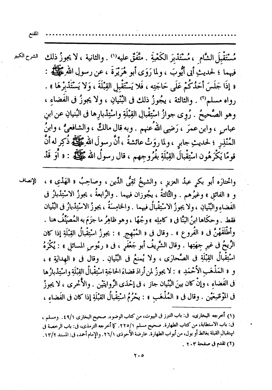 واخْتارَه أبو بكرٍ عبدُ العزيزِ، والشيخُ تَقِيُّ الدِّين، وصاحِبُ «الهَدْي»، و «الفائقِ» وغيرُهم. والثَّالثةُ، يجُوزان فيهما. والرابعةُ، يجوزُ الاسْتِدْبارُ في الفَضاءِ والبُنْيانِ، ولا يجوزُ الاسْتِقْبالُ فيهما. والخامِسَةُ، يجوزُ الاسْتِدْبارُ في البُنيان فقط. وحكَاها ابنُ البَنَّا في «كامِلِه» وجْهًا، وهو ظاهِرُ ما جزَمَ به المُصَنِّفُ هنا. وأطْلَقَهُنَّ في «الفُروْع». وقال في «المُبْهِج»: يجوزُ اسْتِقبالُ القِبْلَةِ إذا كان الرِّيحُ في غيرِ جِهَتِها. وقال الشَّرِيفُ أبو جَعْفرٍ، في «رءُوس المسائلِ»: يُكْرَهُ اسْتِقْبالُ القِبْلَةِ في الصَّحارَى، ولا يُمنعُ في البُنْيانِ. وقال في «الهِدايَةِ»، و «المَذْهَبِ الأحْمَدِ»: لا يجوزُ لمن أرادَ قضاءَ الحاجَةِ اسْتِقْبالُ القِبْلَةِ واسْتِدْبارُها في الفَضاءِ، وإنْ كان بينَ البُنْيان جاز، في إحْدَى الرِّوايتَين. والأخْرى، لا يجوزُ في الموْضِعَين. وقال في «المُذْهَبِ»: يحْرُمُ اسْتِقْبالُ القبْلَةِ إذا كان في الفَضاءِ،