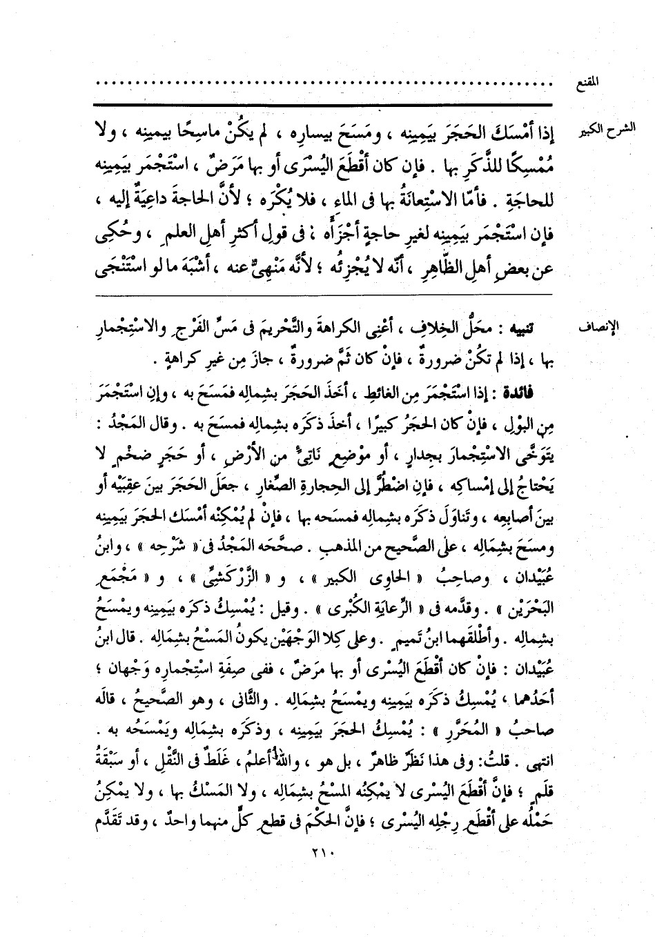 فائدة: إذا اسْتَجْمَرَ مِن الغائطِ، أخَذَ الحَجَرَ بشِمالِه فمَسَحَ به، وإنِ اسْتَجْمَرَ مِن البولِ، فإنَّ كان الحجَرُ كبيرًا، أخذَ ذكَرَه بشِمالِه فمسَحَ به. وقال المَجْدُ: يتَوَخَّى الاسْتِجْمارَ بجِدارٍ، أو موضع نَاتِيء من الأرْض، أو حَجَر ضخم لا يَحْتاجُ إلى إمْساكِه، فإنِ اضطر إلى الحِجارةِ الصغارِ، جعَلَ الحَجَرَ بينَ عقِبَيه أو بينَ أصابِعِه، وتَناولَ ذكَرَه بشِمالِه فمسَحه بها، فإنَّ لم يُمْكِنْه أمْسَك الحجَرَ بيمينه ومسَحَ بشِمَالِه، على الصَّحيح من المذهبِ. صححَه المَجْدُ في «شَرْحِه»، وابنُ عُبَيدان، وصاحِبُ «الحاوي الكبير»، و «الزرْكَشِيِّ»، و «مَجْمَع البَحْرَين». وقدَّمه في «الرِّعايَة الكُبْرى». وقيل: يُمْسِكُ ذكرَه بيمينه ويمْسَحُ بشِمالِه. وأطْلقَهما ابنُ تَميم. وعلى كِلا الوَجْهَين يكونُ المَسْحُ بشِمَالِه. قال ابنُ عُبَيدان: فإنَّ كان أقْطَعَ اليُسْرى أو بها مرَض، ففي صِفَةِ اسْتِجْمارِه وَجْهان؛ أحَدُهما، يُمْسِكُ ذكَرَه بيمينه ويمْسَحُ بشِمَالِه. والثاني، وهو الصَّحيحُ، قاله صاحبُ «المُحَرَّرِ»: يُمْسِكُ الحجَرَ بيمينه، وذكَرَه بشِمَالِه ويَمْسَحُه به. انتهى. قلتُ: وفي هذا نَظر ظاهر، بل هو، والله أعلمُ، غَلَطٌ في النقْلِ، أو سَبْقَةُ قلَمٍ؛ فإنَّ أقْطَعَ اليُسْرى لا يَمكِنُه المسْحُ بشِمَالِه، ولا المَسْكُ بها، ولا يمْكِنُ حَملُه على أقْطَع رِجْلِه اليُسرى؛ فإنَّ الحكْمَ في قطع كل منهما واحدٌ، وقد تَقَدَّم