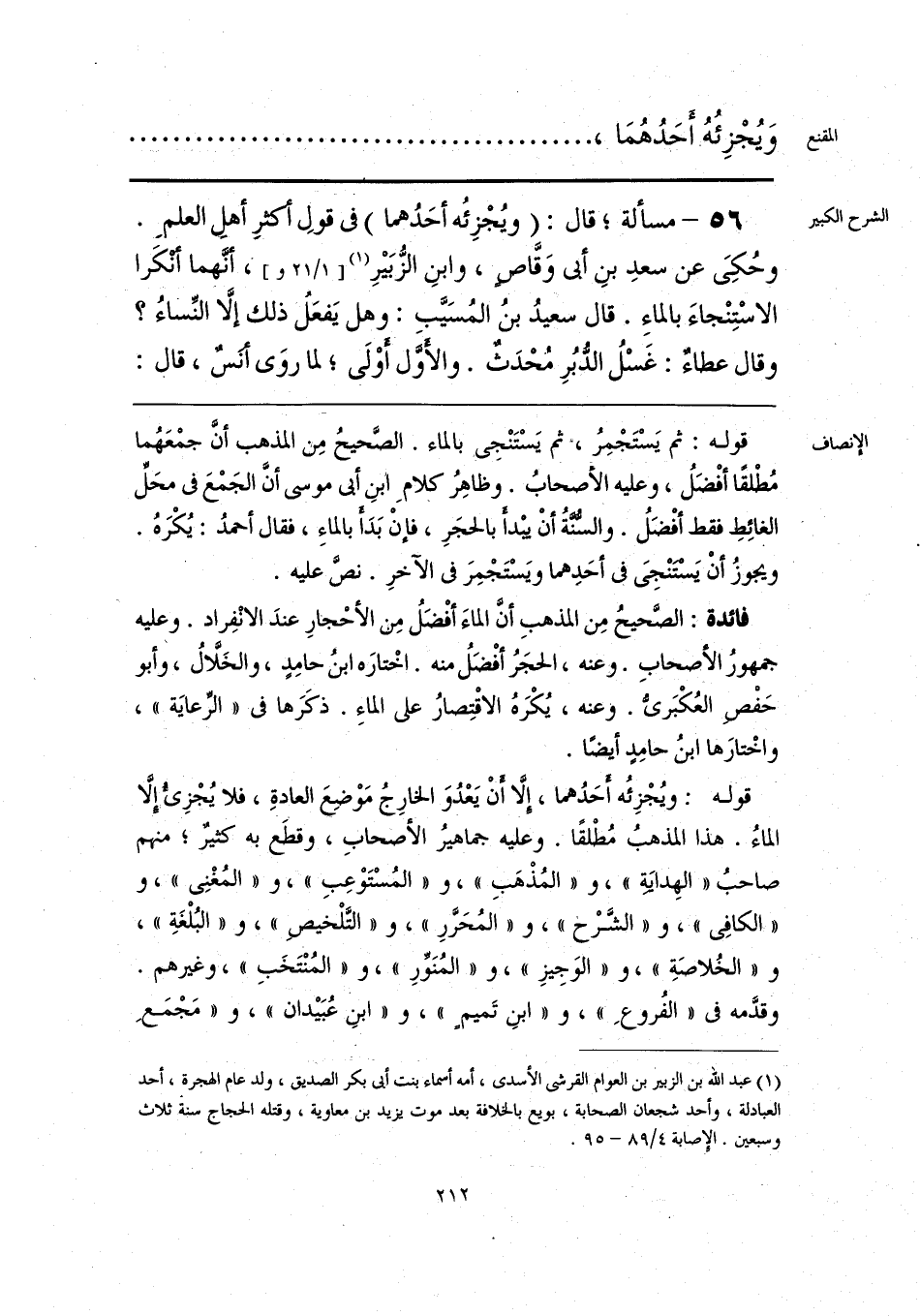 فائدة: الصحيحُ مِن المذهبِ أن الماءَ أفْضَلُ مِن الأحْجارِ عندَ الانْفِراد. وعليه جمهورُ الأصحابِ. وعنه، الحجَرُ أفْضَلُ منه. اخْتارَه ابنُ حامِدٍ، والخَلالُ، وأبو حَفْص العُكْبَريُّ. وعنه، يُكْرَهُ الاقْتِصارُ على الماءِ. ذكَرَها في «الرِّعايَة»، واخْتارَها ابنُ حامِد أيضًا.