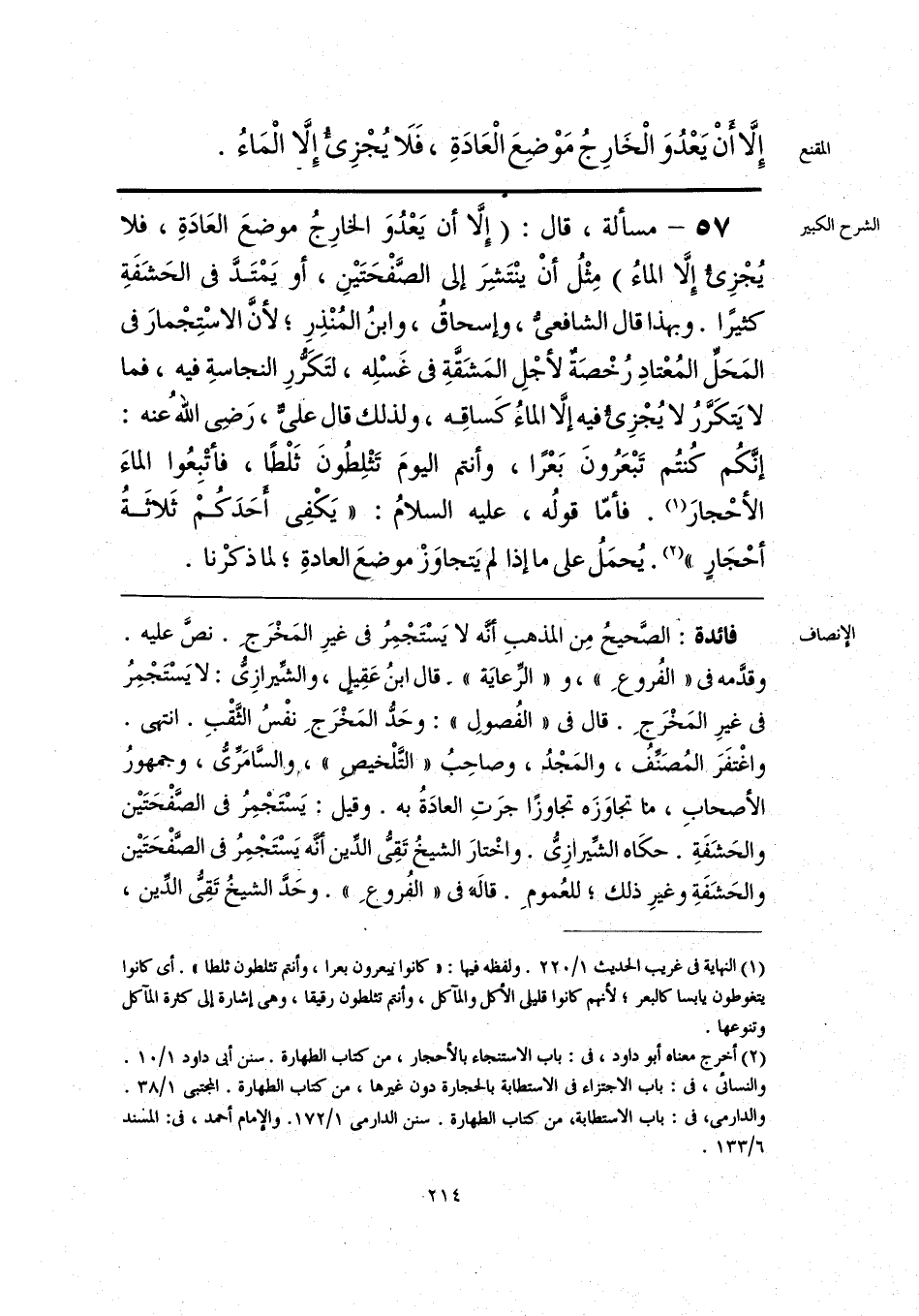 فائدة: الصَّحيحُ مِن المذهبِ أنَّه لا يَسْتَجْمِرُ في غيرِ المَخْرَجِ. نصَّ عليه. وقدَّمه في «الفُروعِ»، و «الرِّعايَة». قال ابنُ عَقِيل، والشِّيرازِي: لا يَسْتَجْمِرُ في غيرِ المَخْرَجِ. قال في «الفُصولِ»: وحَدُّ المَخْرَجِ نفْسُ الثَّقْبِ. انتهى. واغْتفَرَ المُصَنِّفُ، والمَجْدُ، وصاحِبُ «التَّلْخيص»، والسَّامَريُّ، وجمهورُ الأصحابِ، ما تجاوَزَه تجاوزًا جرَتِ العادَةُ به. وقيل: يَسْتَجْمِرُ في الصَّفْحَتَين والحَشَفَةِ. حكَاه الشِّيرازِيُّ. واخْتارَ الشيخُ تَقِيُّ الدِّين أنَّه يَسْتَجْمِرُ في الصَّفْحَتَين والحَشَفَةِ وغيرِ ذلك؛ للعُمومِ. قالهَ في «الفروجِ». وحَدَّ الشيخُ تَقِيُّ الدِّين،